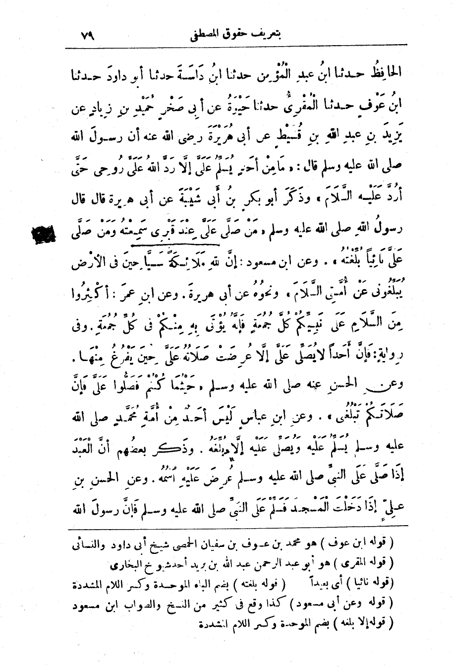الْحَافِظُ حَدَّثَنَا ابْنُ عَبْدِ الْمُؤْمِنِ حَدَّثَنَا ابْنُ دَاسَةَ حَدَّثَنَا أَبُو دَاوُدَ حَدَّثَنَا ابْنُ عَوْفٍ حَدَّثَنَا الْمُقْرِئُ حَدَّثَنَا حَيْوَةُ عَنْ أَبِي صَخْرٍ حُمَيْدِ بْنِ زِيَادٍ عَنْ يَزِيدَ بْنِ عَبْدِ اللَّهِ بْنِ قُسَيْطٍ عَنْ أَبِي هُرَيْرَةَ رَضِيَ الله عَنْهُ أَنَّ رَسُولَ الله صلى الله عَلَيْهِ وَسَلَّمَ قَالَ: (مَا مِنْ أَحَدٍ يُسَلِّمُ عَلَيَّ إِلَّا رَدَّ اللَّهُ عَلَيَّ رُوحِي حَتَّى أَرُدَّ عَلَيْهِ السَّلَامَ) وَذَكَر أَبُو بَكْر بن أَبِي شَيْبَة عَن أَبِي هُرَيْرَة قَال قَال رسول الله صلى الله عليه وسلم (من صَلَّى عَلَيَّ عِنْدَ قَبْرِي سَمِعْتُهُ وَمَنْ صَلَّى عَلَيَّ نَائِيًا بُلِّغْتُهُ) .