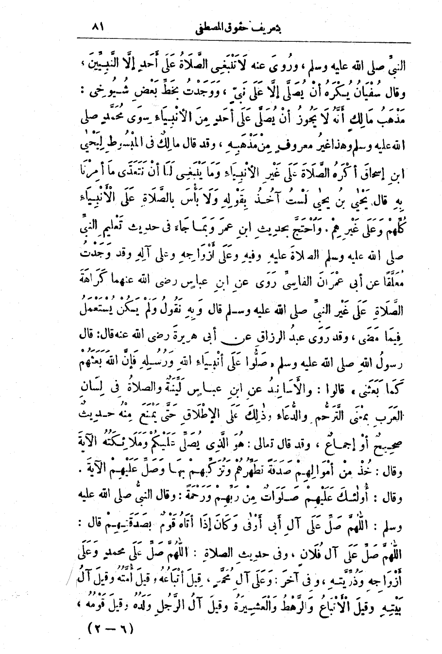 النَّبِيِّ صَلَّى اللَّهُ عَلَيْهِ وَسَلَّمَ، وَرُوِيَ عَنْهُ لَا تَنْبَغِي الصَّلَاةُ عَلَى أَحَدٍ إِلَّا النَّبِيِّينَ، وَقَالَ سُفْيَانُ يُكْرَهُ أَنْ يُصَلَّى إِلَّا عَلَى نَبِيٍّ، وَوَجَدْتُ بِخَطِّ بعض شيوخ: مَذْهَبُ مَالِكٍ أَنَّهُ لَا يَجُوزُ أَنْ يصل عَلَى أحَد مِن الْأَنْبِيَاء سِوَى مُحَمَّد صَلَّى اللَّه عَلَيْه وَسَلَّم وَهَذَا غَيْر معروف من مَذْهِبه، وَقَد قَال مَالِك فِي المْبسُوط لِيَحْيَى ابن إِسْحَاق أكْرَه الصَّلَاة على غير الأنيباء وما ينبغى لما أَن نَتَعَدَّى مَا أمِرْنَا بِه قَال يَحْيَى بن يَحْيَى لسْت آخُذ بِقَوْلِه وَلَا بَأْس بِالصَّلَاة عَلَى الْأَنْبِيَاء كلهم وَعَلَى غَيْرِهِم.