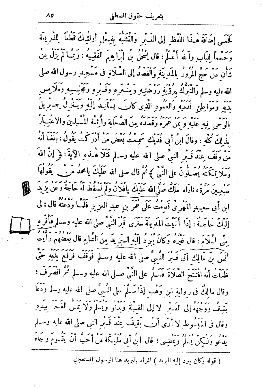 فَحَمَى إضَافَة هَذَا اللّفْظ إِلَى القَبْر وَالتَّشَبُّه بِفِعْل أولئِك قَطْعًا لِلذّرِيعَة وَحَسْمًا لِلْبَاب والله أَعْلَم، قَال إِسْحَاق بن إبْرَاهِيم الْفَقِيه: ومما لَم يَزَل من شَأْن من حَجّ المُرُور بالمَدِينَة وَالْقَصْد إِلَى الصَّلَاة فِي مسجد رَسُول اللَّه صَلَّى اللَّه عَلَيْه وَسَلَّم وَالتَّبَرُّك بِرُؤْيَة رَوْضَتِه وَمنْبَرِه وَقَبْرِه وَمَجْلِسِه وَمَلامِس يَدَيْه وَمَوَاطِئ قَدَمَيْه وَالعَمُود الذى كان يستبد إليْه وَيَنْزِل جِبْرِيل بِالْوَحْي فِيه عَلَيْه وَبِمَن عمره وقصده مِن الصَّحَابَة وأئِمَّة المُسْلِمين والاعْتِبَار بِذَلِك كُلّه، وقال ابن أَبِي فُديْك سَمِعْت بَعْض من أَدْرَكْت يَقُول: بَلَغَنَا أنَّه من وَقَف عِنْد قبر النَّبِيّ صَلَّى اللَّه عَلَيْه وَسَلَّم فَتَلَا هَذِه الآيَة: (إِنَّ اللَّهَ وَمَلائِكَتَهُ يُصَلُّونَ عَلَى النَّبِيِّ) ثُمَّ قَال صَلَّى اللَّه عَلَيْك يَا مُحَمَّد من يَقُولُهَا سَبْعِين مَرَّة، نادَاه مَلَك صَلَّى اللَّه عَلَيْك يَا فُلان وَلَم تَسْقُط لَه حَاجة وَعَن يَزِيد ابن أَبِي سَعِيد المَهْرِيّ قَدِمْت عَلَى عُمَر بن عَبْد الْعَزِيز فَلَمّا وَدَّعْتُه قَال: لِي إِلَيْك حاجة: إذَا أتَيْت الْمَدِينَة سَتَرَى قَبْر النَّبِيّ صَلَّى اللَّه عَلَيْه وَسَلَّم فَأَقْرِه منّي السَّلَام، قَال غَيْرُه وَكَان يُبْرِد إلَيْه البَرِيد مِن الشَّام قَال بَعْضُهُم رَأَيْت أَنَس بن مَالِك أتى قَبْر النَّبِيّ صَلَّى اللَّه عَلَيْه وَسَلَّم فَوَقَف فَرَفَع يَدَيْه حَتَّى ظَنَنْت أنَّه افْتتح الصَّلَاة فَسَلَّم عَلَى النَّبِيّ صَلَّى اللَّه عَلَيْه وَسَلَّم ثُمّ انْصَرَف وَقَال مَالِك فِي رِوَايَة ابن وَهْب إذَا سَلَم عَلَى النَّبِيّ صَلَّى الله عَلَيْه وَسَلَّم وَدَعَا يقف ووجه إِلَى القَبْر لَا إِلَى القِبْلَة وَيَدْنُو وَيُسَلّم وَلَا يَمَسّ القَبْر بِيَدِه وَقَال في المَبْسُوط لَا أرَى أَن يَقِف عِنْد قبر النَّبِيّ صَلَّى اللَّه عَلَيْه وَسَلَّم يَدْعُو وَلكِن يُسَلّم ويَمْضِي، قَال ابن أَبِي مُلَيْكَة من أحَبّ أن يقوم وجاء