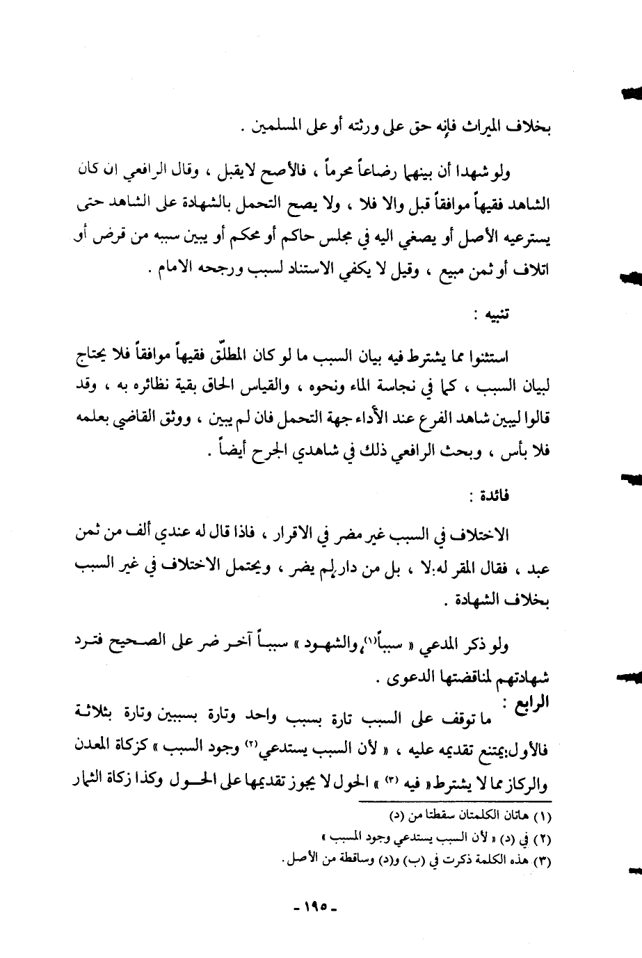 تَنْبِيهٌ: اسْتَثْنَوْا مِمَّا يُشْتَرَطُ فِيهِ بَيَانُ السَّبَبِ مَا لَوْ كَانَ الْمُطَلِّقُ فَقِيهًا مُوَافِقًا فَلَا يَحْتَاجُ لِبَيَانِ السَّبَبِ، كَمَا فِي نَجَاسَةِ الْمَاءِ وَنَحْوِهِ، وَالْقِيَاسُ إلْحَاقُ بَقِيَّةِ نَظَائِرِهِ بِهِ، وَقَدْ قَالُوا لِيُبَيِّنَ شَاهِدُ الْفَرْعِ عِنْدَ الْأَدَاءِ جِهَةَ التَّحَمُّلِ فَإِنْ لَمْ يُبَيِّنْ، وَوَثِقَ الْقَاضِي بِعِلْمِهِ فَلَا بَأْسَ، وَبَحَثَ الرَّافِعِيُّ ذَلِكَ فِي شَاهِدَيْ الْجَرْحِ أَيْضًا
