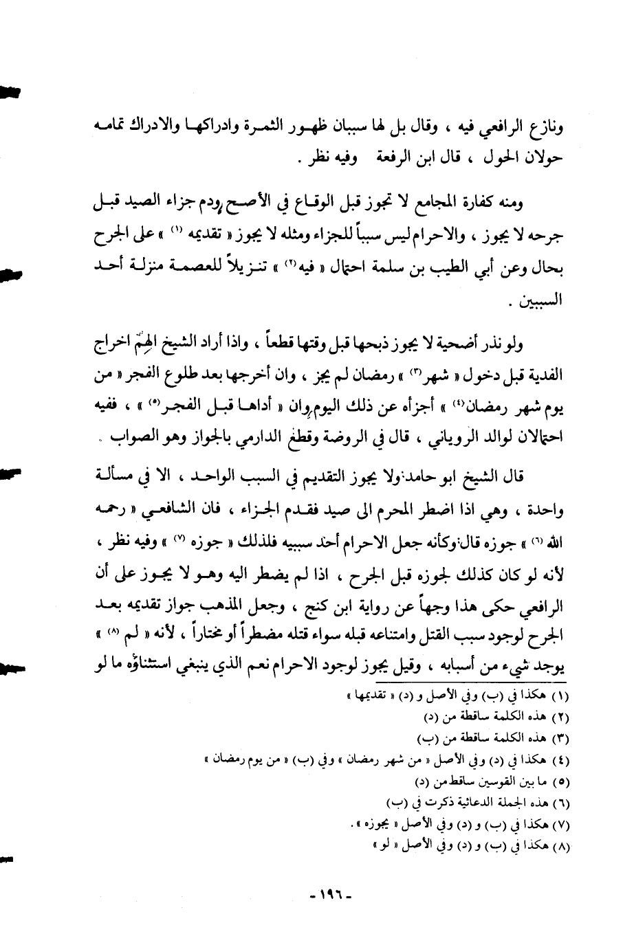 وَمِنْهُ كَفَّارَةُ الْمُجَامِعِ لَا تَجُوزُ قَبْلَ الْوِقَاعِ فِي الْأَصَحِّ، وَدَمُ جَزَاءِ الصَّيْدِ قَبْلَ جُرْحِهِ لَا يَجُوزُ، وَالْإِحْرَامُ لَيْسَ سَبَبًا لِلْجَزَاءِ وَمِثْلُهُ لَا يَجُوزُ " تَقْدِيمُهُ " عَلَى الْجُرْحِ بِحَالٍ وَعَنْ أَبِي الطَّيِّبِ بْنِ سَلَمَةَ احْتِمَالٌ " فِيهِ " تَنْزِيلًا لِلْعِصْمَةِ مَنْزِلَةَ أَحَدِ السَّبَبَيْنِ.