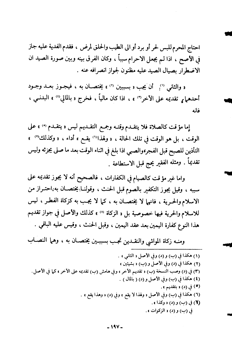 وَإِمَّا غَيْرُ مُؤَقَّتٍ كَالصِّيَامِ فِي الْكَفَّارَاتِ، فَالصَّحِيحُ أَنَّهُ لَا يَجُوزُ تَقْدِيمُهُ عَلَى سَبَبِهِ، وَقِيلَ: يَجُوزُ التَّكْفِيرُ بِالصَّوْمِ قَبْلَ الْحِنْثِ، وَقَوْلُنَا: يَخْتَصَّانِ بِهِ، احْتِرَازٌ مِنْ الْإِسْلَامِ وَالْحُرِّيَّةِ، فَإِنَّهُمَا لَا يَخْتَصَّانِ بِهِ، كَمَا لَا يَجِبُ بِهِ كَزَكَاةِ الْفِطْرِ، لَيْسَ لِلْإِسْلَامِ وَالْحُرِّيَّةِ فِيهَا خُصُوصِيَّةٌ بَلْ " الزَّكَاةُ " كَذَلِكَ وَالْأَصْلُ فِي جَوَازِ تَقْدِيمِ هَذَا النَّوْعِ كَفَّارَةُ الْيَمِينِ بَعْدَ عَقْدِ الْيَمِينِ، وَقَبْلَ الْحِنْثِ، وَقِيسَ عَلَيْهِ الْبَاقِي. وَمِنْهُ زَكَاةُ الْمَوَاشِي وَالنَّقْدَيْنِ تَجِبُ بِسَبَبَيْنِ يَخْتَصَّانِ بِهَا، وَهُمَا النِّصَابُ