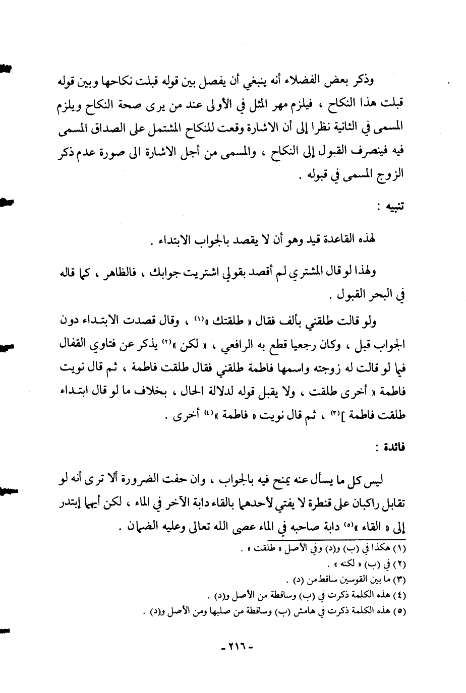 وَلَوْ قَالَتْ طَلِّقْنِي بِأَلْفٍ فَقَالَ " طَلَّقْتُك "، وَقَالَ قَصَدْت الِابْتِدَاءَ دُونَ الْجَوَابِ قُبِلَ، وَكَانَ رَجْعِيًّا قَطَعَ بِهِ الرَّافِعِيُّ، " لَكِنْ " يَذْكُرُ عَنْ فَتَاوَى الْقَفَّالِ فِيمَا لَوْ قَالَتْ لَهُ زَوْجَتُهُ وَاسْمُهَا فَاطِمَةُ طَلِّقْنِي فَقَالَ طَلَّقْت فَاطِمَةَ، ثُمَّ قَالَ نَوَيْت فَاطِمَةَ " أُخْرَى طَلُقَتْ، وَلَا يُقْبَلُ قَوْلُهُ لِدَلَالَةِ الْحَالِ، بِخِلَافِ مَا لَوْ قَالَ ابْتِدَاءً طَلَّقْت [فَاطِمَةَ] ، ثُمَّ قَالَ نَوَيْت " فَاطِمَةَ " أُخْرَى. فَائِدَةٌ لَيْسَ كُلُّ مَا يُسْأَلُ عَنْهُ يُمْنَحُ فِيهِ بِالْجَوَابِ، وَإِنْ حَفَّتْ الضَّرُورَةُ أَلَا تَرَى أَنَّهُ لَوْ تَقَابَلَ رَاكِبَانِ عَلَى قَنْطَرَةٍ لَا يُفْتَى لِأَحَدِهِمَا بِإِلْقَاءِ دَابَّةِ الْآخَرِ فِي الْمَاءِ، لَكِنْ أَيُّهُمَا ابْتَدَرَ إلَى " إلْقَاءِ " دَابَّةِ صَاحِبِهِ فِي الْمَاءِ عَصَى اللَّهَ تَعَالَى وَعَلَيْهِ الضَّمَانُ.