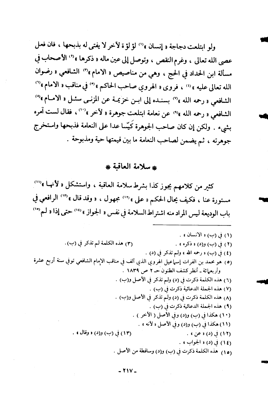 وَلَوْ ابْتَلَعَتْ دَجَاجَةُ " إنْسَانٍ " لُؤْلُؤَةً لِآخَرَ لَا يُفْتَى لَهُ بِذَبْحِهَا، فَإِنْ فَعَلَ عَصَى اللَّهَ تَعَالَى، وَغَرِمَ النَّقْصَ، وَتُوَصِّلَ إلَى عَيْنِ مَالِهِ. " ذَكَرَهَا " الْأَصْحَابُ فِي مَسْأَلَةِ ابْنِ الْحَدَّادِ فِي الْحَجِّ، وَهِيَ مِنْ مَنَاصِيصِ " الْإِمَامِ " الشَّافِعِيِّ " رِضْوَانُ اللَّهِ تَعَالَى عَلَيْهِ "، فَرَوَى " الْهَرَوِيُّ صَاحِبُ الْحَاكِمِ " فِي مَنَاقِبِ الْإِمَامِ " الشَّافِعِيِّ " - رَحِمَهُ اللَّهُ - " بِسَنَدِهِ إلَى ابْنِ خُزَيْمَةَ عَنْ الْمُزَنِيِّ سُئِلَ " الْإِمَامُ " الشَّافِعِيُّ " - رَحِمَهُ اللَّهُ - " عَنْ نَعَامَةٍ ابْتَلَعَتْ جَوْهَرَةً " لِآخَرَ "، فَقَالَ لَسْت آمُرُهُ بِشَيْءٍ.