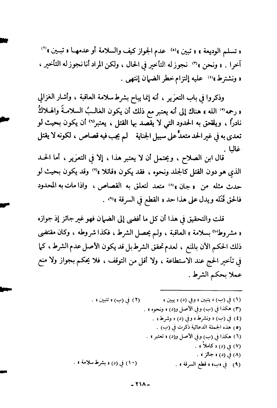 قَالَ ابْنُ الصَّلَاحِ: وَيُحْتَمَلُ أَنْ لَا يُعْتَبَرَ هَذَا، إلَّا فِي التَّعْزِيرِ، أَمَّا الْحَدُّ الَّذِي هُوَ دُونَ الْقَتْلِ كَالْجَلْدِ وَنَحْوِهِ، فَقَدْ يَكُونُ " قَاتِلًا " وَقَدْ يَكُونُ بِحَيْثُ لَوْ حَدَثَ مِثْلُهُ مِنْ " جَانٍ " مُتَعَدٍّ لَتَعَلَّقَ بِهِ الْقِصَاصُ، وَإِذَا مَاتَ بِهِ الْمَحْدُودُ فَالْحَقُّ قَتْلُهُ وَيَدُلُّ عَلَى هَذَا حَدُّ " الْقَطْعِ فِي السَّرِقَةِ " قُلْت وَالتَّحْقِيقُ فِي هَذَا أَنَّ كُلَّ مَا أَفْضَى إلَى الضَّمَانِ فَهُوَ غَيْرُ جَائِزٍ إذْ جَوَازُهُ " مَشْرُوطٌ بِسَلَامَةِ " الْعَاقِبَةِ، وَلَمْ يَحْصُلْ الشَّرْطُ، فَكَذَا شُرُوطُهُ، وَكَانَ مُقْتَضَى ذَلِكَ الْحُكْمِ الْآنَ بِالْمَنْعِ، لِعَدَمِ تَحَقُّقِ الشَّرْطِ بَلْ قَدْ يَكُونُ الْأَصْلُ عَدَمَ الشَّرْطِ، كَمَا فِي تَأْخِيرِ الْحَجِّ عِنْدَ الِاسْتِطَاعَةِ، وَلَا أَقَلَّ مِنْ التَّوَقُّفِ، فَلَا يُحْكَمُ بِجَوَازٍ وَلَا مَنْعٍ عَمَلًا بِحُكْمِ الشَّرْطِ.