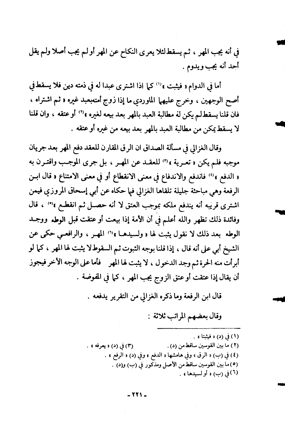وَقَالَ الْغَزَالِيُّ فِي مَسْأَلَةِ الصَّدَاقِ أَنَّ الرِّقَّ الْمُقَارِنَ لِلْعَقْدِ دَفَعَ الْمَهْرَ بَعْدَ جَرَيَانِ مُوجِبِهِ فَلَمْ يَكُنْ " تَعْرِيَةً " لِلْعَقْدِ عَنْ الْمَهْرِ، بَلْ جَرَى الْمُوجِبُ وَاقْتَرَنَ بِهِ " الدَّفْعُ " فَانْدَفَعَ وَالِانْدِفَاعُ فِي مَعْنَى الِانْقِطَاعِ أَوْ فِي مَعْنَى الِامْتِنَاعِ " قَالَ ابْنُ الرِّفْعَةِ وَهِيَ مُبَاحَثَةٌ جَلِيلَةٌ تَلَقَّاهَا الْغَزَالِيُّ فِيمَا حَكَاهُ عَنْ أَبِي إِسْحَاقَ الْمَرْوَزِيِّ فِيمَنْ اشْتَرَى قَرِيبَهُ أَنَّهُ يَنْدَفِعُ مِلْكُهُ بِمُوجَبِ الْعِتْقِ لَا أَنَّهُ حَصَلَ ثُمَّ انْقَطَعَ "، قَالَ وَفَائِدَةُ ذَلِكَ تَظْهَرُ وَاَللَّهُ أَعْلَمُ فِي أَنَّ الْأَمَةَ إذَا بِيعَتْ أَوْ عَتَقَتْ قَبْلَ الْوَطْءِ وَوُجِدَ الْوَطْءُ بَعْدَ ذَلِكَ لَا نَقُولُ يَثْبُتُ لَهَا " وَلِسَيِّدِهَا " الْمَهْرُ، وَالرَّافِعِيُّ حَكَى عَنْ الشَّيْخِ أَبِي عَلِيٍّ أَنَّهُ قَالَ، إذَا قُلْنَا بِوَجْهِ الثُّبُوتِ ثُمَّ السُّقُوطِ لَا يَثْبُتُ لَهَا الْمَهْرُ، كَمَا لَوْ أَبْرَأَتْ مِنْهُ الْحُرَّةُ ثُمَّ وُجِدَ الدُّخُولُ، لَا يَثْبُتُ لَهَا الْمَهْرُ فَأَمَّا عَلَى الْوَجْهِ الْآخَرِ فَيَجُوزُ أَنْ يُقَالَ إذَا عَتَقَتْ أَوْ عَتَقَ الزَّوْجُ يَجِبُ الْمَهْرُ، كَمَا فِي الْمُفَوِّضَةِ.