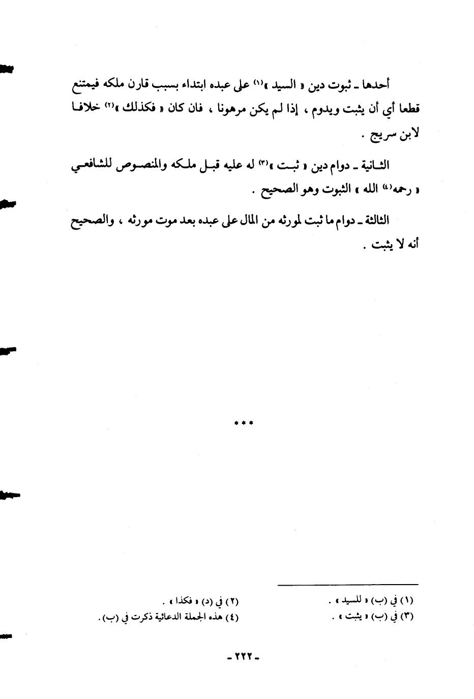 الثَّانِيَةُ - دَوَامُ دَيْنٍ " ثَبَتَ " لَهُ عَلَيْهِ قَبْلَ مِلْكِهِ وَالْمَنْصُوصُ لِلشَّافِعِيِّ " - رَحِمَهُ اللَّهُ - " الثُّبُوتُ وَهُوَ الصَّحِيحُ.