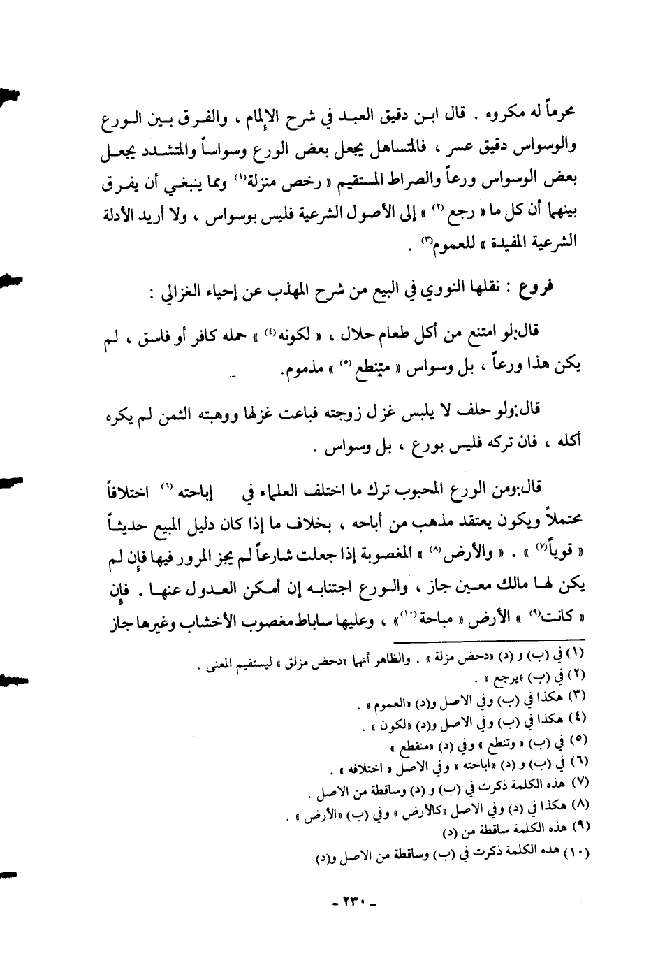 فُرُوعٌ: نَقَلَهَا النَّوَوِيُّ فِي الْبَيْعِ مِنْ شَرْحِ الْمُهَذَّبِ عَنْ إحْيَاءِ الْغَزَالِيِّ: قَالَ: لَوْ امْتَنَعَ مِنْ أَكْلِ طَعَامٍ حَلَالٍ، " لِكَوْنِهِ " حَمَلَهُ كَافِرٌ أَوْ فَاسِقٌ، لَمْ يَكُنْ هَذَا وَرَعًا، بَلْ وَسْوَاسٌ " مُتَنَطِّعٌ " مَذْمُومٌ.