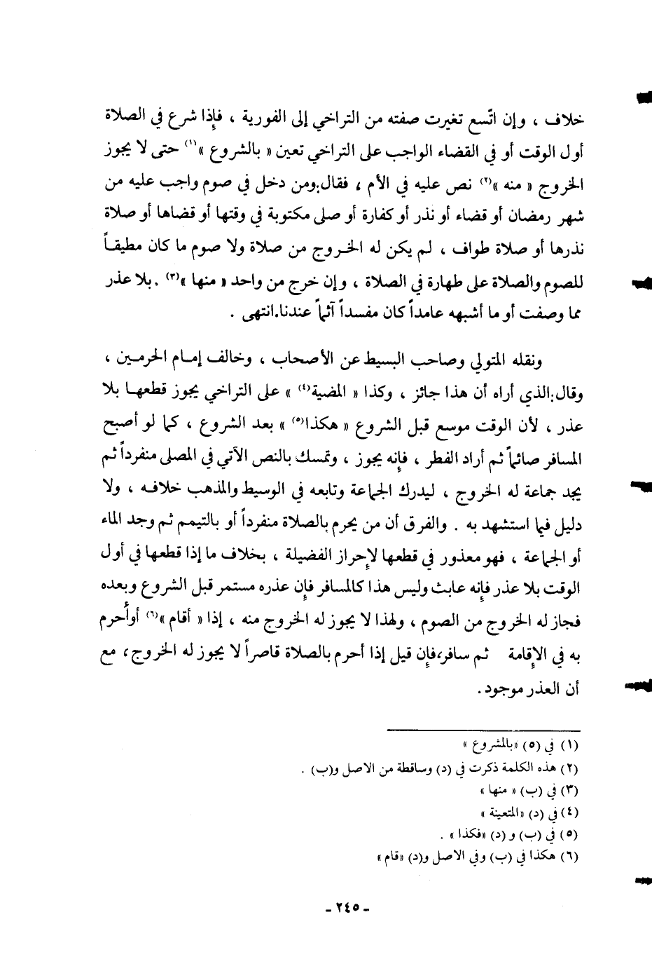 وَنَقَلَهُ الْمُتَوَلِّي وَصَاحِبُ الْبَسِيطِ عَنْ الْأَصْحَابِ، وَخَالَفَ إمَامُ الْحَرَمَيْنِ، وَقَالَ: الَّذِي أَرَاهُ أَنَّ هَذَا جَائِزٌ، وَكَذَا " الْمُضِيَّةُ " عَلَى التَّرَاخِي يَجُوزُ قَطْعُهَا بِلَا عُذْرٍ، لِأَنَّ الْوَقْتَ مُوَسَّعٌ قَبْلَ الشُّرُوعِ " هَكَذَا " بَعْدَ الشُّرُوعِ، كَمَا لَوْ أَصْبَحَ الْمُسَافِرُ صَائِمًا ثُمَّ أَرَادَ الْفِطْرَ، فَإِنَّهُ يَجُوزُ، وَتَمَسَّكَ بِالنَّصِّ الْآتِي فِي الْمُصَلِّي مُنْفَرِدًا ثُمَّ يَجِدُ جَمَاعَةً لَهُ الْخُرُوجُ، لِيُدْرِكَ الْجَمَاعَةَ وَتَابَعَهُ فِي الْوَسِيطِ وَالْمَذْهَبُ خِلَافُهُ، وَلَا دَلِيلَ فِيمَا اسْتَشْهَدَ بِهِ.