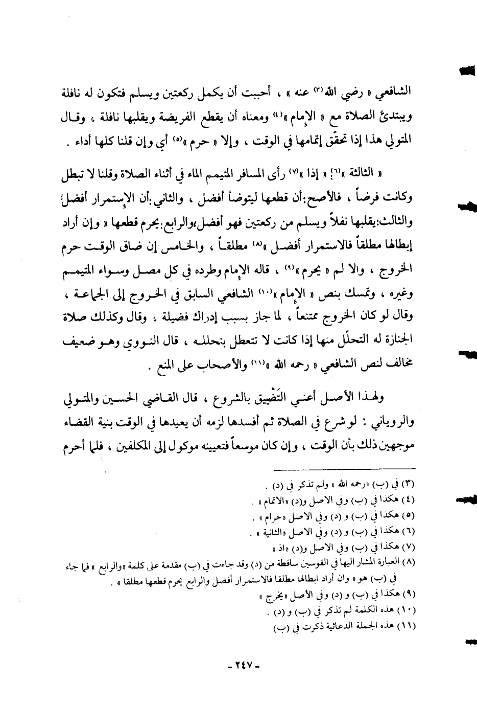 " الثَّالِثَةُ ": " إذَا " رَأَى الْمُسَافِرُ الْمُتَيَمِّمُ الْمَاءَ فِي أَثْنَاءِ الصَّلَاةِ وَقُلْنَا لَا تَبْطُلُ وَكَانَتْ فَرْضًا، فَالْأَصَحُّ: أَنَّ قَطْعَهَا لِيَتَوَضَّأَ أَفْضَلُ، وَالثَّانِي: أَنَّ الِاسْتِمْرَارَ أَفْضَلُ، وَالثَّالِثُ: يَقْلِبُهَا نَفْلًا وَيُسَلِّمُ مِنْ رَكْعَتَيْنِ فَهُوَ أَفْضَلُ " وَالرَّابِعُ: يَحْرُمُ قَطْعُهَا " وَإِنْ أَرَادَ إبْطَالَهَا مُطْلَقًا فَالِاسْتِمْرَارُ أَفْضَلُ " مُطْلَقًا، وَالْخَامِسُ إنْ ضَاقَ الْوَقْتُ حَرُمَ الْخُرُوجُ، وَإِلَّا لَمْ " يَحْرُمْ "، قَالَهُ الْإِمَامُ وَطَرَدَهُ فِي كُلِّ مُصَلٍّ وَسَوَاءٌ الْمُتَيَمِّمُ وَغَيْرُهُ، وَتَمَسَّكَ بِنَصِّ " الْإِمَامِ الشَّافِعِيِّ السَّابِقِ فِي الْخُرُوجِ إلَى الْجَمَاعَةِ، وَقَالَ لَوْ كَانَ الْخُرُوجُ مُمْتَنِعًا، لَمَا جَازَ بِسَبَبِ إدْرَاكِ فَضِيلَةٍ، وَقَالَ وَكَذَلِكَ صَلَاةُ الْجِنَازَةِ لَهُ التَّحَلُّلُ مِنْهَا إذَا كَانَتْ لَا تَتَعَطَّلُ بِتَحَلُّلِهِ، قَالَ النَّوَوِيُّ وَهُوَ ضَعِيفٌ مُخَالِفٌ لِنَصِّ الشَّافِعِيِّ " - رَحِمَهُ اللَّهُ - " وَالْأَصْحَابُ عَلَى الْمَنْعِ.