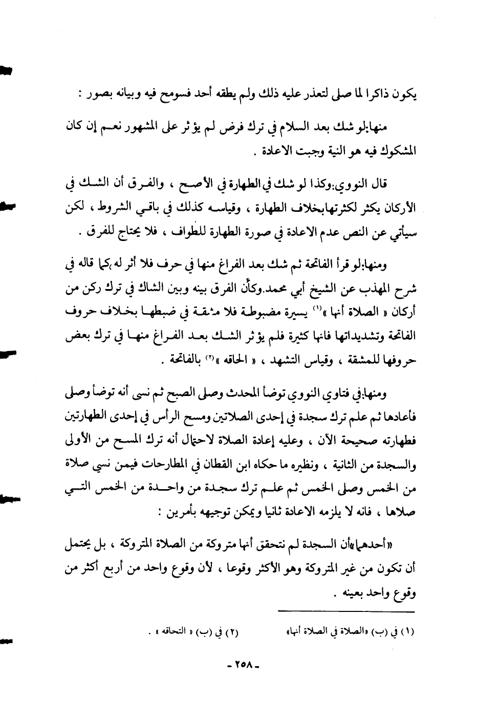 وَمِنْهَا: فِي فَتَاوَى النَّوَوِيِّ تَوَضَّأَ الْمُحْدِثُ وَصَلَّى الصُّبْحَ ثُمَّ نَسِيَ أَنَّهُ تَوَضَّأَ وَصَلَّى فَأَعَادَهَا ثُمَّ عَلِمَ تَرْكَ سَجْدَةٍ فِي إحْدَى الصَّلَاتَيْنِ وَمَسْحَ الرَّأْسِ فِي إحْدَى الطَّهَارَتَيْنِ فَطَهَارَتُهُ صَحِيحَةٌ الْآنَ، وَعَلَيْهِ إعَادَةُ الصَّلَاةِ لِاحْتِمَالِ أَنَّهُ تَرَكَ الْمَسْحَ مِنْ الْأُولَى وَالسَّجْدَةَ مِنْ الثَّانِيَةِ، وَنَظِيرُهُ مَا حَكَاهُ ابْنُ الْقَطَّانِ فِي الْمُطَارَحَاتِ فِيمَنْ نَسِيَ صَلَاةً مِنْ الْخَمْسِ وَصَلَّى الْخَمْسَ ثُمَّ عَلِمَ تَرْكَ سَجْدَةٍ مِنْ وَاحِدَةٍ مِنْ الْخَمْسِ الَّتِي صَلَّاهَا، فَإِنَّهُ لَا يَلْزَمُهُ الْإِعَادَةُ ثَانِيًا وَيُمْكِنُ تَوْجِيهُهُ بِأَمْرَيْنِ: " أَحَدُهُمَا " أَنَّ السَّجْدَةَ لَمْ نَتَحَقَّقْ أَنَّهَا مَتْرُوكَةٌ مِنْ الصَّلَاةِ الْمَتْرُوكَةِ، بَلْ يُحْتَمَلُ أَنْ تَكُونَ مِنْ غَيْرِ الْمَتْرُوكَةِ وَهُوَ الْأَكْثَرُ وُقُوعًا، لِأَنَّ وُقُوعَ وَاحِدٍ مِنْ أَرْبَعٍ أَكْثَرُ مِنْ وُقُوعِ وَاحِدٍ بِعَيْنِهِ.