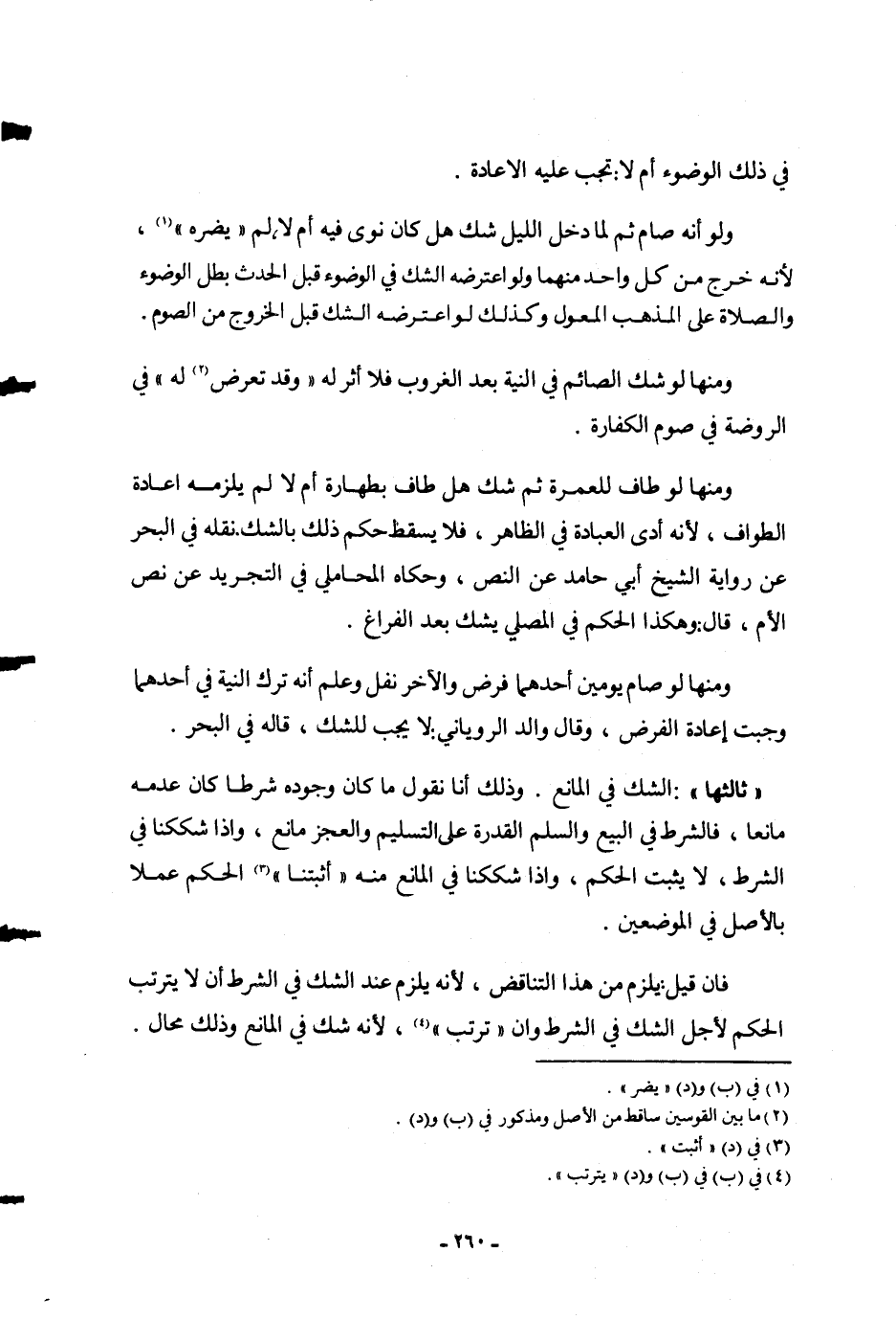 وَلَوْ أَنَّهُ صَامَ ثُمَّ لَمَّا دَخَلَ اللَّيْلُ شَكَّ هَلْ كَانَ نَوَى فِيهِ أَمْ لَا، لَمْ " يَضُرَّهُ "، لِأَنَّهُ خَرَجَ مِنْ كُلِّ وَاحِدٍ مِنْهُمَا وَلَوْ اعْتَرَضَهُ الشَّكُّ فِي الْوُضُوءِ قَبْلَ الْحَدَثِ بَطَلَ الْوُضُوءُ وَالصَّلَاةُ عَلَى الْمَذْهَبِ الْمُعَوَّلِ وَكَذَلِكَ لَوْ اعْتَرَضَهُ الشَّكُّ قَبْلَ الْخُرُوجِ مِنْ الصَّوْمِ.
