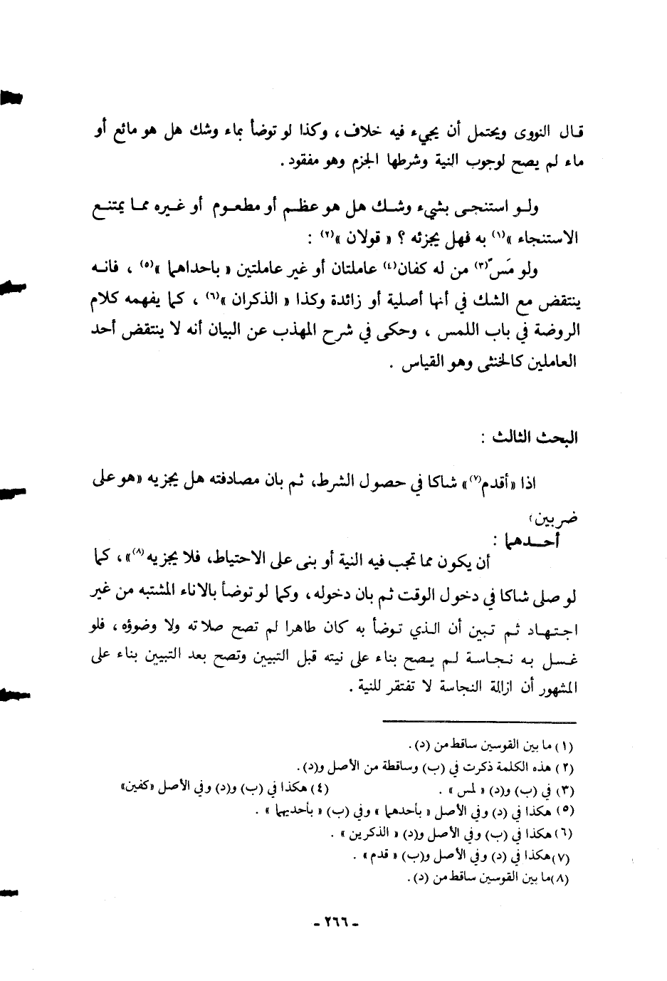وَلَوْ اسْتَنْجَى بِشَيْءٍ وَشَكَّ هَلْ هُوَ عَظْمٌ أَوْ مَطْعُومٌ أَوْ غَيْرُهُ مِمَّا يَمْتَنِعُ الِاسْتِنْجَاءُ " بِهِ فَهَلْ يُجْزِئُهُ؟ " قَوْلَانِ ": وَلَوْ مَسَّ مَنْ لَهُ كَفَّانِ عَامِلَتَانِ أَوْ غَيْرَ عَامِلَتَيْنِ " بِإِحْدَاهُمَا "، فَإِنَّهُ يَنْتَقِضُ مَعَ الشَّكِّ فِي أَنَّهَا أَصْلِيَّةٌ أَوْ زَائِدَةٌ وَكَذَا " الذَّكَرَانِ "، كَمَا يُفْهِمُهُ كَلَامُ الرَّوْضَةِ فِي بَابِ اللَّمْسِ، وَحَكَى فِي شَرْحِ الْمُهَذَّبِ عَنْ الْبَيَانِ أَنَّهُ لَا يَنْتَقِضُ أَحَدُ الْعَامِلِينَ كَالْخُنْثَى وَهُوَ الْقِيَاسُ.