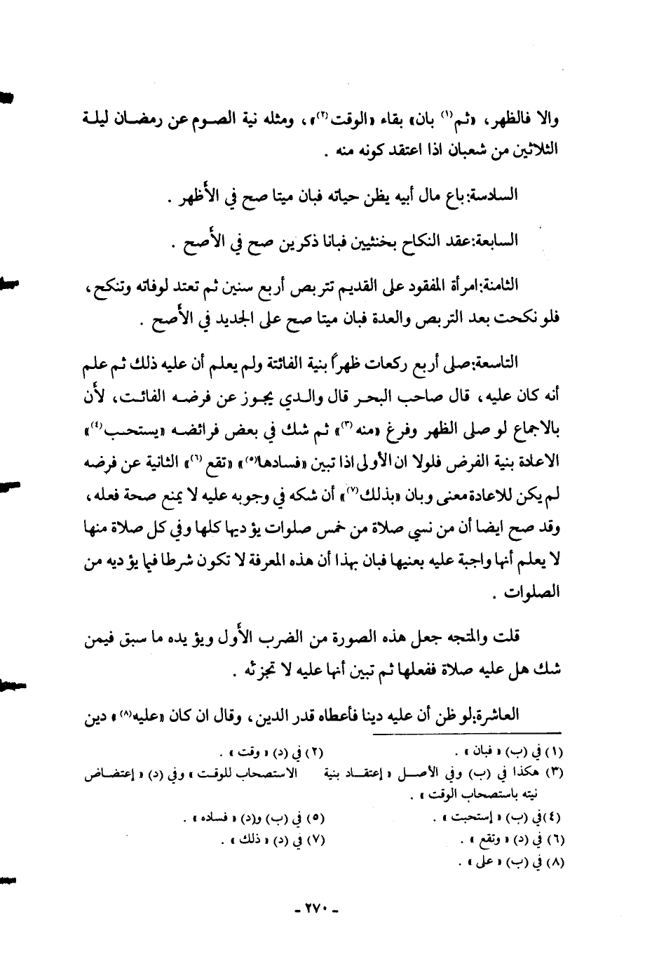 التَّاسِعَةُ: صَلَّى أَرْبَعَ رَكَعَاتٍ ظُهْرًا بِنِيَّةِ الْفَائِتَةِ وَلَمْ يَعْلَمْ أَنَّ عَلَيْهِ ذَلِكَ ثُمَّ عَلِمَ أَنَّهُ كَانَ عَلَيْهِ، قَالَ صَاحِبُ الْبَحْرِ قَالَ وَالِدِي يَجُوزُ عَنْ فَرْضِهِ الْفَائِتِ، لِأَنَّ بِالْإِجْمَاعِ لَوْ صَلَّى الظُّهْرَ وَفَرَغَ " مِنْهُ " ثُمَّ شَكَّ فِي بَعْضِ فَرَائِضِهِ " يُسْتَحَبُّ " الْإِعَادَةُ بِنِيَّةِ الْفَرْضِ فَلَوْلَا أَنَّ الْأُولَى إذَا تَبَيَّنَ " فَسَادُهَا " " تَقَعُ " الثَّانِيَةُ عَنْ فَرْضِهِ لَمْ يَكُنْ لِلْإِعَادَةِ مَعْنًى وَبَانَ " بِذَلِكَ " أَنَّ شَكَّهُ فِي وُجُوبِهِ عَلَيْهِ لَا يَمْنَعُ صِحَّةَ فِعْلِهِ، وَقَدْ صَحَّ أَيْضًا أَنْ مَنْ نَسِيَ صَلَاةً مِنْ خَمْسِ صَلَوَاتٍ يُؤَدِّيهَا كُلَّهَا وَفِي كُلِّ صَلَاةٍ مِنْهَا لَا يَعْلَمُ أَنَّهَا وَاجِبَةٌ عَلَيْهِ بِعْنِيهَا فَبَانَ بِهَذَا أَنَّ هَذِهِ الْمَعْرِفَةَ لَا تَكُونُ شَرْطًا فِيمَا يُؤَدِّيه مِنْ الصَّلَوَاتِ. قُلْت وَالْمُتَّجَهُ جَعْلُ هَذِهِ الصُّورَةِ مِنْ الضَّرْبِ الْأَوَّلِ وَيُؤَيِّدُهُ مَا سَبَقَ فِيمَنْ شَكَّ هَلْ عَلَيْهِ صَلَاةٌ فَفَعَلَهَا ثُمَّ تَبَيَّنَ أَنَّهَا عَلَيْهِ لَا تُجْزِئُهُ.