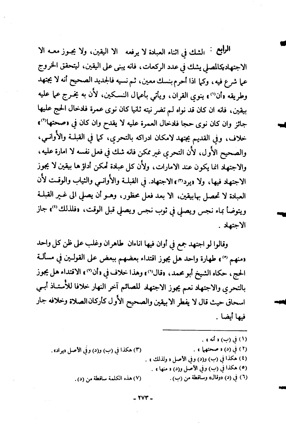 الرَّابِعُ: الشَّكُّ فِي أَثْنَاءِ الْعِبَادَةِ لَا يَرْفَعُهُ إلَّا الْيَقِينُ، وَلَا يَجُوزُ مَعَهُ إلَّا الِاجْتِهَادُ، كَالْمُصَلِّي يَشُكُّ فِي عَدَدِ الرَّكَعَاتِ، فَإِنَّهُ يَبْنِي عَلَى الْيَقِينِ، لِيَتَحَقَّقَ الْخُرُوجُ عَمَّا شَرَعَ فِيهِ، وَكَمَا إذَا أَحْرَمَ بِنُسُكٍ مُعَيَّنٍ، ثُمَّ نَسِيَهُ فَالْجَدِيدُ الصَّحِيحُ أَنَّهُ لَا يَجْتَهِدُ وَطَرِيقُهُ " أَنْ " يَنْوِيَ الْقِرَانَ، وَيَأْتِيَ بِأَعْمَالِ النُّسُكَيْنِ، لِأَنَّ بِهِ يَخْرُجُ عَمَّا عَلَيْهِ بِيَقِينٍ، فَإِنَّهُ إنْ كَانَ قَدْ نَوَاهُ لَمْ تَضُرَّ نِيَّتُهُ ثَانِيًا كَأَنْ نَوَى عُمْرَةً فَإِدْخَالُ الْحَجِّ عَلَيْهَا جَائِزٌ وَإِنْ كَانَ نَوَى حَجًّا فَإِدْخَالُ الْعُمْرَةِ عَلَيْهِ لَا يَقْدَحُ وَإِنْ كَانَ فِي " صِحَّتِهَا " خِلَافٌ، وَفِي الْقَدِيمِ يَجْتَهِدُ لِإِمْكَانِ ادِّرَاكِهِ بِالتَّحَرِّي، كَمَا فِي الْقِبْلَةِ وَالْأَوَانِي، وَالصَّحِيحُ الْأَوَّلُ، لِأَنَّ التَّحَرِّيَ غَيْرُ مُمْكِنٍ فَإِنَّهُ شَكٌّ فِي فِعْلِ نَفْسِهِ لَا إمَارَةَ عَلَيْهِ، وَالِاجْتِهَادُ إنَّمَا يَكُونُ عِنْدَ الْإِمَارَاتِ، وَلِأَنَّ كُلَّ عِبَادَةٍ أَمْكَنَ أَدَاؤُهَا بِيَقِينٍ لَا يَجُوزُ الِاجْتِهَادُ فِيهَا، وَلَا " يُرَدُّ " الِاجْتِهَادُ.