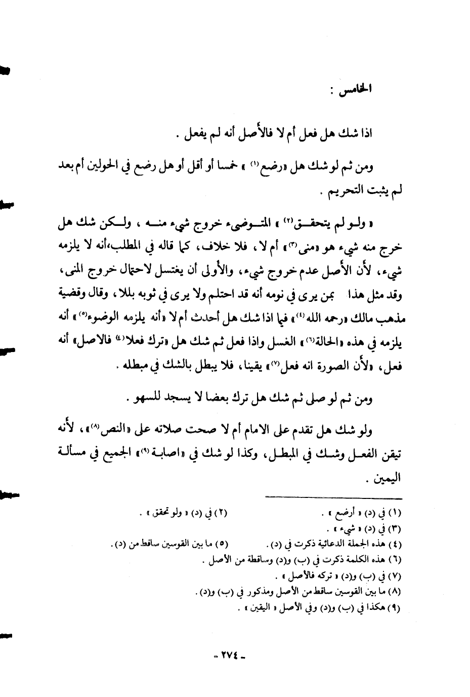 الْخَامِسُ: إذَا شَكَّ هَلْ فَعَلَ أَمْ لَا فَالْأَصْلُ أَنَّهُ لَمْ يَفْعَلْ.