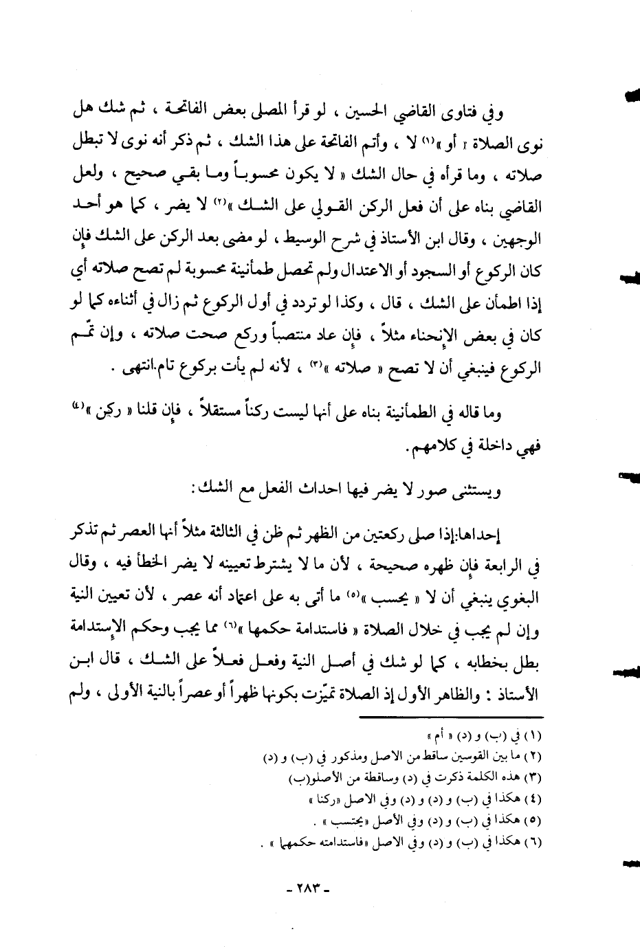 وَفِي فَتَاوَى الْقَاضِي الْحُسَيْنِ، لَوْ قَرَأَ الْمُصَلِّي بَعْضَ الْفَاتِحَةِ، ثُمَّ شَكَّ هَلْ نَوَى الصَّلَاةَ " أَوْ " لَا، وَأَتَمَّ الْفَاتِحَةَ عَلَى هَذَا الشَّكِّ، ثُمَّ ذَكَرَ أَنَّهُ نَوَى لَا تَبْطُلُ صَلَاتُهُ، وَمَا قَرَأَهُ فِي حَالِ الشَّكِّ " لَا يَكُونُ مَحْسُوبًا وَمَا بَقِيَ صَحِيحٌ، وَلَعَلَّ الْقَاضِيَ بَنَاهُ عَلَى أَنَّ فِعْلَ الرُّكْنِ الْقَوْلِيِّ عَلَى الشَّكِّ " لَا يَضُرُّ، كَمَا هُوَ أَحَدُ الْوَجْهَيْنِ، وَقَالَ ابْنُ الْأُسْتَاذِ فِي شَرْحِ الْوَسِيطِ، لَوْ مَضَى بَعْدَ الرُّكْن عَلَى الشَّكِّ فَإِنْ كَانَ الرُّكُوعُ أَوْ السُّجُودُ أَوْ الِاعْتِدَالُ وَلَمْ تَحْصُلْ طُمَأْنِينَةٌ مَحْسُوبَةٌ لَمْ تَصِحَّ صَلَاتُهُ أَيْ إذَا اطْمَأَنَّ عَلَى الشَّكِّ، قَالَ، وَكَذَا لَوْ تَرَدَّدَ فِي أَوَّلِ الرُّكُوعِ ثُمَّ زَالَ فِي أَثْنَائِهِ كَمَا لَوْ كَانَ فِي بَعْضِ الِانْحِنَاءِ مَثَلًا، فَإِنْ عَادَ مُنْتَصِبًا وَرَكَعَ صَلَاتَهُ، وَإِنْ تَمَّمَ الرُّكُوعَ فَيَنْبَغِي أَنْ لَا تَصِحَّ " صَلَاتُهُ "، لِأَنَّهُ لَمْ يَأْتِ بِرُكُوعٍ تَامٍّ. انْتَهَى.
