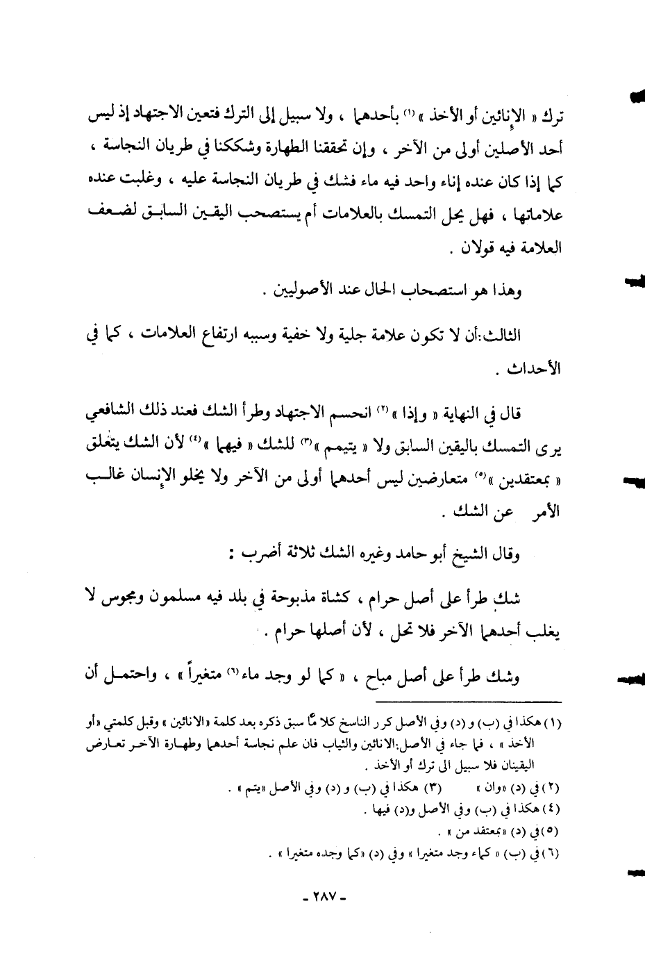 وَقَالَ الشَّيْخُ أَبُو حَامِدٍ وَغَيْرُهُ الشَّكُّ ثَلَاثَةُ أَضْرُبٍ: شَكٌّ طَرَأَ عَلَى أَصْلٍ حَرَامٍ، كَشَاةٍ مَذْبُوحَةٍ فِي بَلَدٍ فِيهِ فِيهِ مُسْلِمُونَ وَمَجُوسٌ لَا يَغْلِبُ أَحَدُهُمَا الْآخَرُ فَلَا تَحِلُّ، لِأَنَّ أَصْلَهَا حَرَامٌ.
