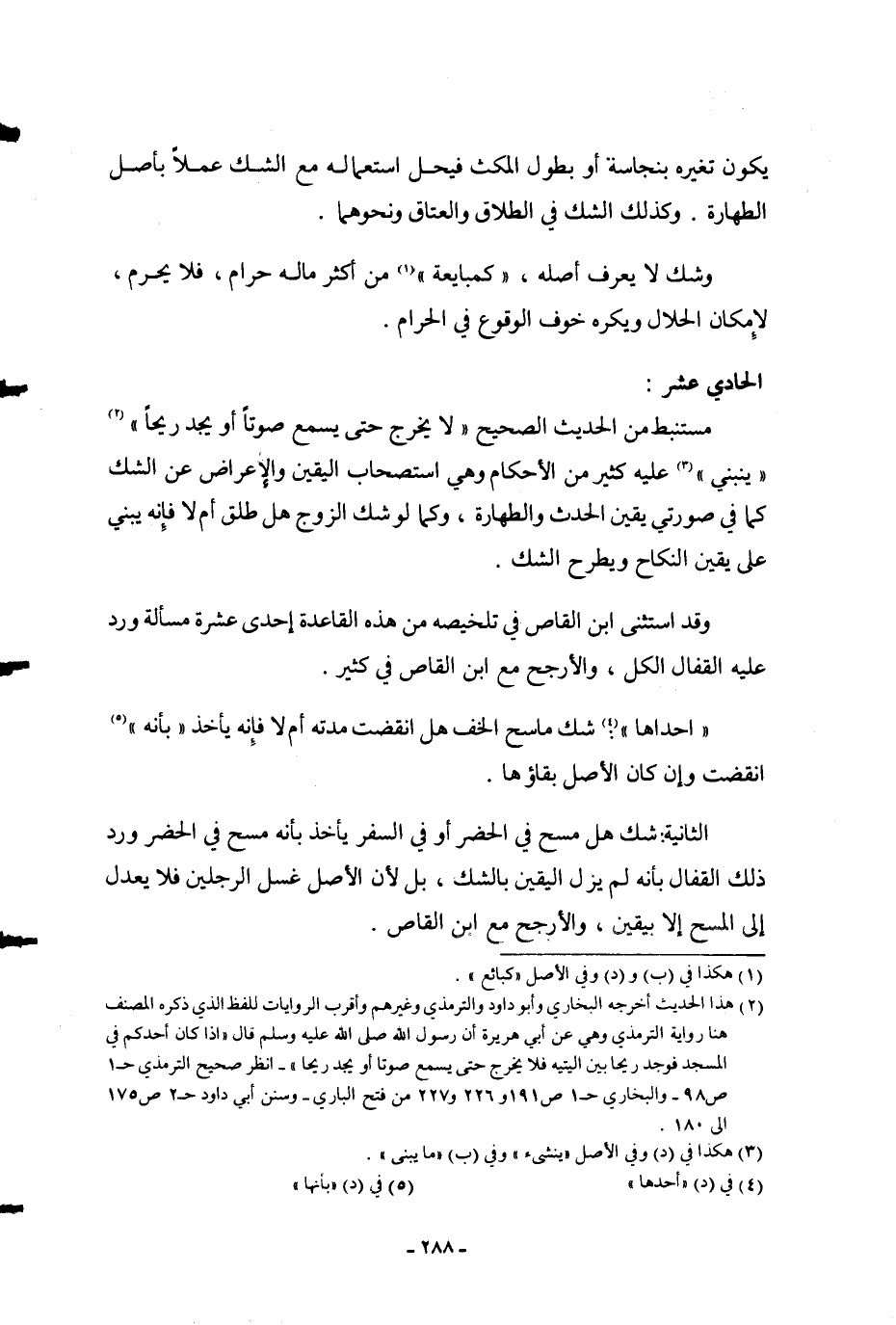 الْحَادِي عَشَرَ: مُسْتَنْبَطٌ مِنْ الْحَدِيثِ الصَّحِيحِ «لَا يَخْرُجُ حَتَّى يَسْمَعَ صَوْتًا أَوْ يَجِدَ رِيحًا» يَنْبَنِي " عَلَيْهِ كَثِيرٌ مِنْ الْأَحْكَامِ وَهِيَ اسْتِصْحَابُ الْيَقِينِ وَالْإِعْرَاضُ عَنْ الشَّكِّ كَمَا فِي صُورَتَيْ يَقِينِ الْحَدَثِ وَالطَّهَارَةِ، وَكَمَا لَوْ شَكَّ الزَّوْجُ هَلْ طَلَّقَ أَمْ لَا فَإِنَّهُ يَبْنِي عَلَى يَقِينِ النِّكَاحِ وَيَطْرَحُ الشَّكَّ.