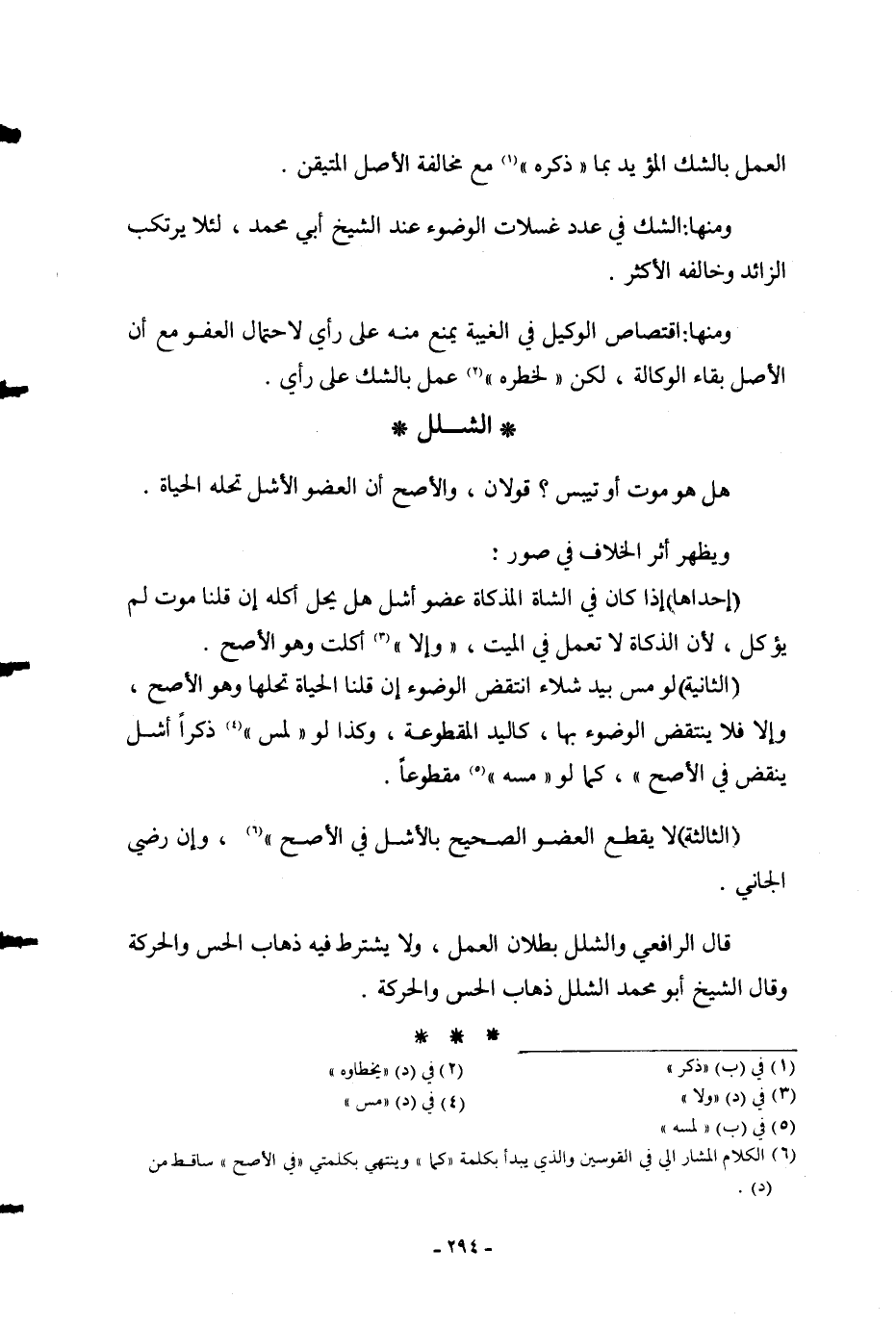ٌ؟ قَوْلَانِ، وَالْأَصْلُ أَنَّ الْعُضْوَ الْأَشَلَّ تَحِلُّهُ الْحَيَاةُ. وَيَظْهَرُ أَثَرُ الْخِلَافِ فِي صُوَرٍ: (إحْدَاهَا) إذَا كَانَ فِي الشَّاةِ الْمُذَكَّاةِ عُضْوٌ أَشَلُّ هَلْ يَحِلُّ أَكْلُهُ إنْ قُلْنَا مَوْتٌ لَمْ يُؤْكَلْ، لِأَنَّ الذَّكَاةَ لَا تَعْمَلُ فِي الْمَيِّتِ، " وَإِلَّا " أُكِلَتْ وَهُوَ الْأَصَحُّ. (الثَّانِيَةُ) لَوْ مَسَّ بِيَدٍ شَلَّاءَ انْتَقَضَ الْوُضُوءُ إنْ قُلْنَا الْحَيَاةُ تَحِلُّهَا وَهُوَ الْأَصَحُّ، وَإِلَّا فَلَا يُنْتَقَضُ الْوُضُوءُ بِهَا، كَالْيَدِ الْمَقْطُوعَةِ، وَكَذَا لَوْ " لَمَسَ " ذَكَرًا أَشَلَّ يُنْقَضُ فِي الْأَصَحِّ "، كَمَا لَوْ " مَسَّهُ " مَقْطُوعًا. (الثَّالِثَةُ) لَا يُقْطَعُ الْعُضْوُ الصَّحِيحُ بِالْأَشَلِّ فِي الْأَصَحِّ "، وَإِنْ رَضِيَ الْجَانِي. قَالَ الرَّافِعِيُّ وَالشَّلَلُ بُطْلَانُ الْعَمَلِ، وَلَا يُشْتَرَطُ فِيهِ ذَهَابُ الْحِسِّ وَالْحَرَكَةِ وَقَالَ الشَّيْخُ أَبُو مُحَمَّدٍ الشَّلَلُ ذَهَابُ الْحِسِّ وَالْحَرَكَةِ.