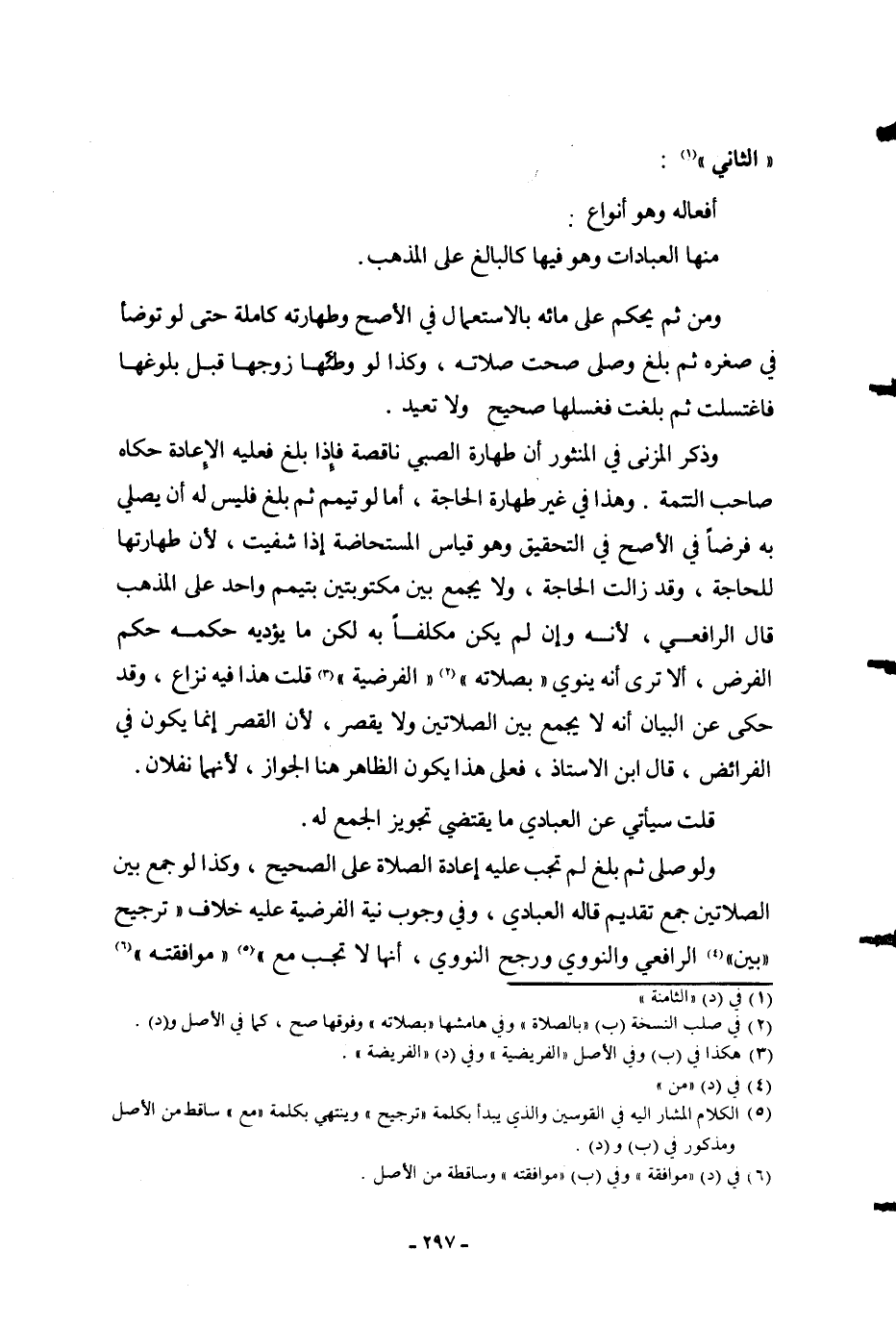 الثَّانِي ": أَفْعَالُهُ وَهُوَ أَنْوَاعٌ: مِنْهَا الْعِبَادَاتُ وَهُوَ فِيهَا كَالْبَالِغِ عَلَى الْمَذْهَبِ. وَمِنْ ثَمَّ يَحْكُمُ عَلَى مَائِهِ بِالِاسْتِعْمَالِ فِي الْأَصَحِّ وَطَهَارَتُهُ كَامِلَةٌ حَتَّى لَوْ تَوَضَّأَ فِي صِغَرِهِ ثُمَّ بَلَغَ وَصَلَّى صَحَّتْ صَلَاتُهُ، وَكَذَا لَوْ وَطِئَهَا زَوْجُهَا قَبْلَ بُلُوغِهَا فَاغْتَسَلَتْ ثُمَّ بَلَغَتْ فَغُسْلُهَا صَحِيحٌ وَلَا تُعِيدُ.