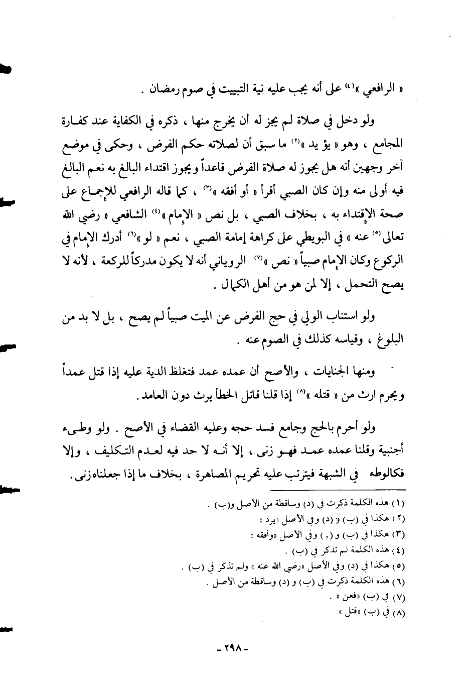 الرَّافِعِيُّ " عَلَى أَنَّهُ يَجِبُ عَلَيْهِ نِيَّةُ التَّبْيِيتِ فِي صَوْمِ رَمَضَانَ. وَلَوْ دَخَلَ فِي صَلَاةٍ لَمْ يَجُزْ لَهُ أَنْ يَخْرُجَ مِنْهَا، ذَكَرَهُ فِي الْكِفَايَةِ عِنْدَ كَفَّارَةِ الْمُجَامِعِ، وَهُوَ " يُؤَيِّدُ " مَا سَبَقَ أَنَّ لِصَلَاتِهِ حُكْمَ الْفَرْضِ، وَحَكَى فِي مَوْضِعٍ آخَرَ وَجْهَيْنِ أَنَّهُ هَلْ يَجُوزُ لَهُ صَلَاةُ الْفَرْضِ قَاعِدًا وَيَجُوزُ اقْتِدَاءُ الْبَالِغِ بِهِ نَعَمْ الْبَالِغُ فِيهِ أَوْلَى مِنْهُ وَإِنْ كَانَ الصَّبِيُّ أَقْرَأَ " أَوْ أَفْقَهَ "، كَمَا قَالَهُ الرَّافِعِيُّ لِلْإِجْمَاعِ عَلَى صِحَّةِ الِاقْتِدَاءِ بِهِ، بِخِلَافِ الصَّبِيِّ، بَلْ نَصَّ " الْإِمَامُ " الشَّافِعِيُّ " - رَضِيَ اللَّهُ تَعَالَى عَنْهُ - " فِي الْبُوَيْطِيِّ عَلَى كَرَاهَةِ إمَامَةِ الصَّبِيِّ، نَعَمْ " لَوْ " أَدْرَكَ الْإِمَامَ فِي الرُّكُوعِ وَكَانَ الْإِمَامُ صَبِيًّا " نَصَّ " الرُّويَانِيِّ أَنَّهُ لَا يَكُونُ مُدْرِكًا لِلرَّكْعَةِ، لِأَنَّهُ لَا يَصِحُّ التَّحَمُّلُ، إلَّا لِمَنْ هُوَ مِنْ أَهْلِ الْكَمَالِ.