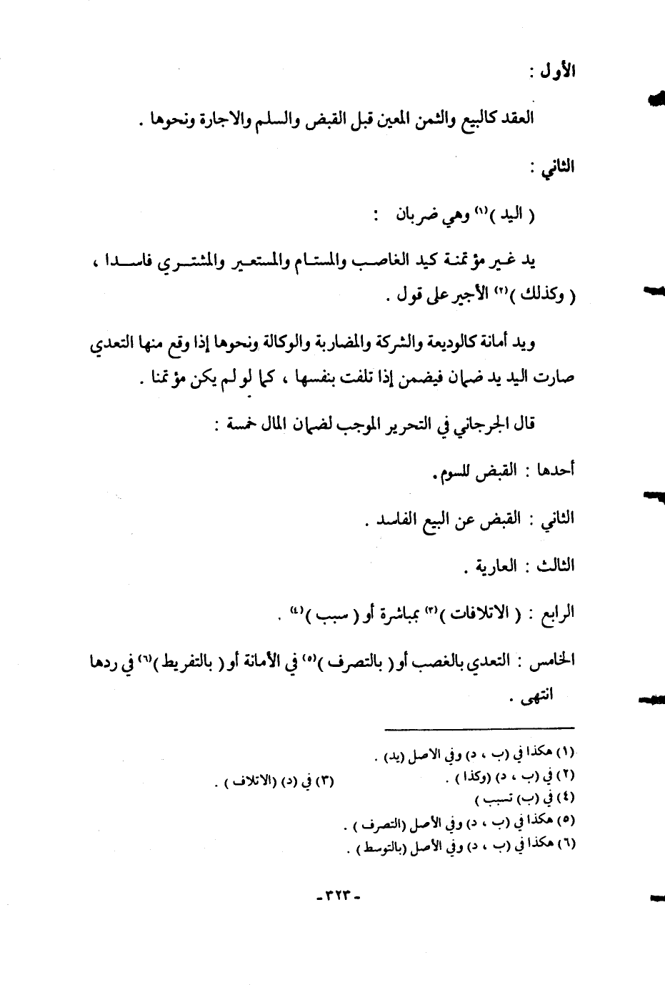 قَالَ الْجُرْجَانِيُّ؛ فِي التَّحْرِيرِ الْمُوجِبُ لِضَمَانِ الْمَالِ خَمْسَةٌ: أَحَدُهَا: الْقَبْضُ لِلسَّوْمِ.