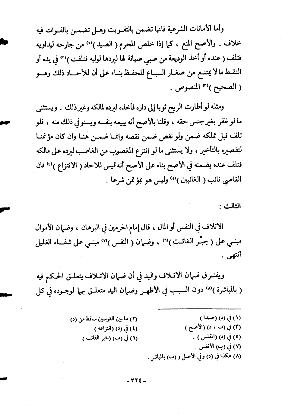 الثَّالِثُ: الْإِتْلَافُ فِي النَّفْسِ أَوْ الْمَالِ، قَالَ إمَامُ الْحَرَمَيْنِ فِي الْبُرْهَانِ، وَضَمَانُ الْأَمْوَالِ مَبْنِيٌّ عَلَى (جَبْرِ الْفَائِتِ) ، وَضَمَانُ (النَّفْسِ) مَبْنِيٌّ عَلَى شِفَاءِ الْغَلِيلِ انْتَهَى.