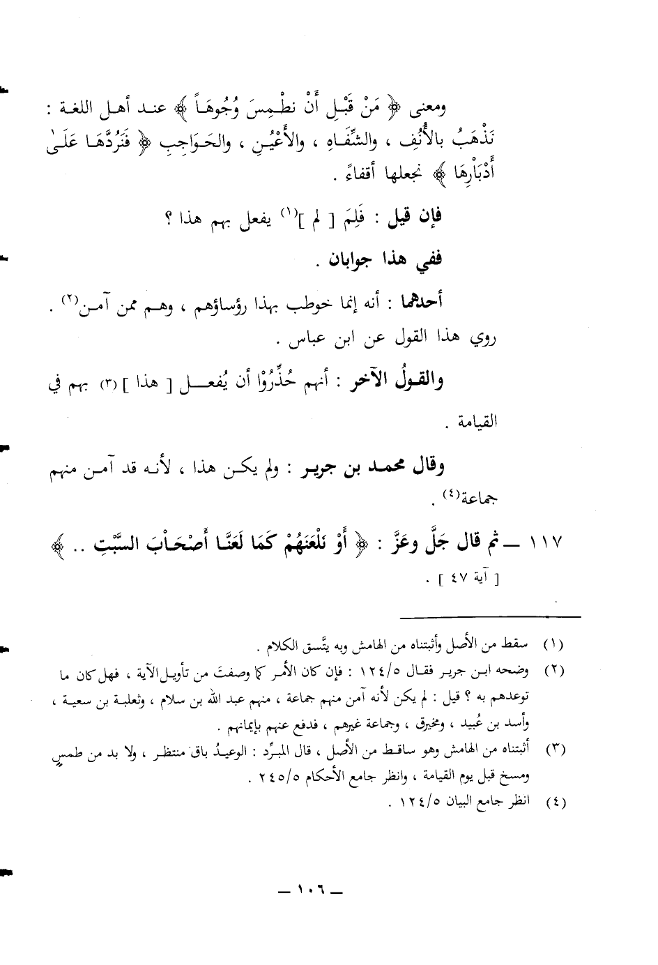 ومعنى (من قبل أن نطمس وجوها) عند أهل اللغة نذهب بالانف والشفاه والاعين والحواجب فنردها على أدبارها نجعلها أقفاء فان قيل فلم (لم) يفعل بهم هذا ففي هذا جوابان أحدهما أنه انما خوطب بهذا رؤساؤهم وهم ممن آمن روي هذا القول عن ابن عباس والقول الآخر أنهم حذروا أن يفعل هذا بهم في القيامة وقال محمد بن جرير ولم يكن هذا لانه قد آمن منهم