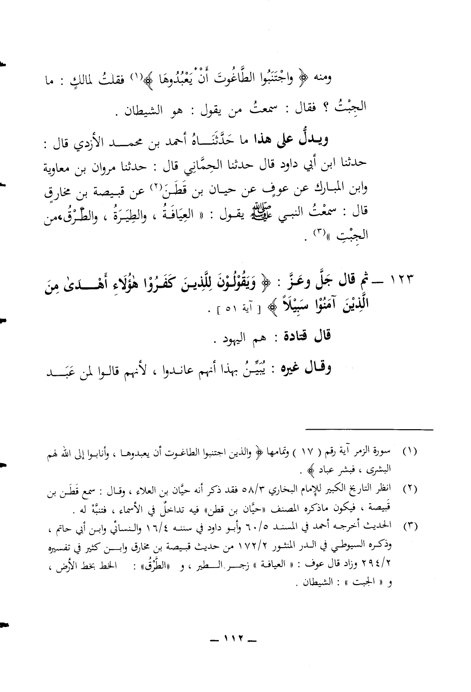 ومنه (واجتنبوا الطاغوت أن يعبدوها) فقلت لمالك ما الجبت فقال سمعت من يقول هو الشيطان ويدل على هذا ما حدثناه أحمد بن محمد الازدي قال حدثنا ابن أبي داود قال حدثنا الحماني قال حدثنا مروان بن معاوية وابن المبارك عن عوف عن حيان بن قطن عن قبيصة بن مخارق قال سمعت النبي رسول الله صلى الله عليه وسلم يقول العيافة والطيرة والطرق من الجبت 123 ثم قال جل وعز (ويقولون للذين كفروا هؤلاء أهدى من الذين آمنوا سبيلا) قال قتادة هم اليهود وقال غيره يبين بهذا أنهم عاندوا لانهم قالوا لمن عبد