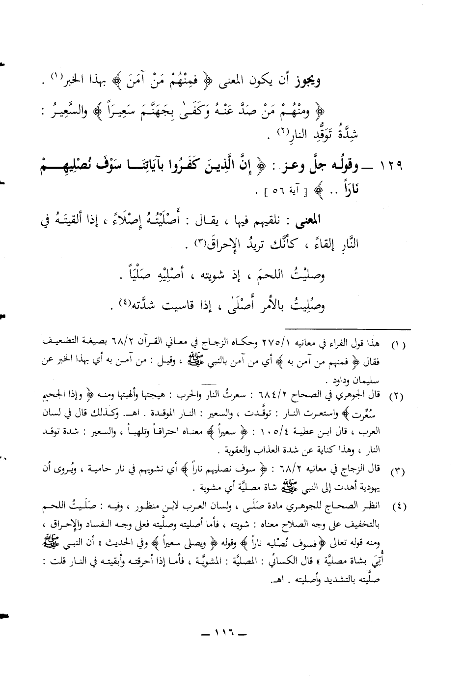 ويجوز أن يكون المعنى (فمنهم من آمن) بهذا الخبر (ومنهم من صد عنه وكفى بجهنم سعيرا) والسعير شدة توقد النار 129 وقوله جل وعز (ان الذين كفروا بآياتنا سوف نصليهم نارا) المعنى نلقيهم فيها يقال أصليته اصلاء ما إذا ألقيته في النار القاء كأنك تريد الاحراق وصليت اللحم إذا شويته أصليه صليا وصليت بالامر أصلى إذا قاسيت شدته