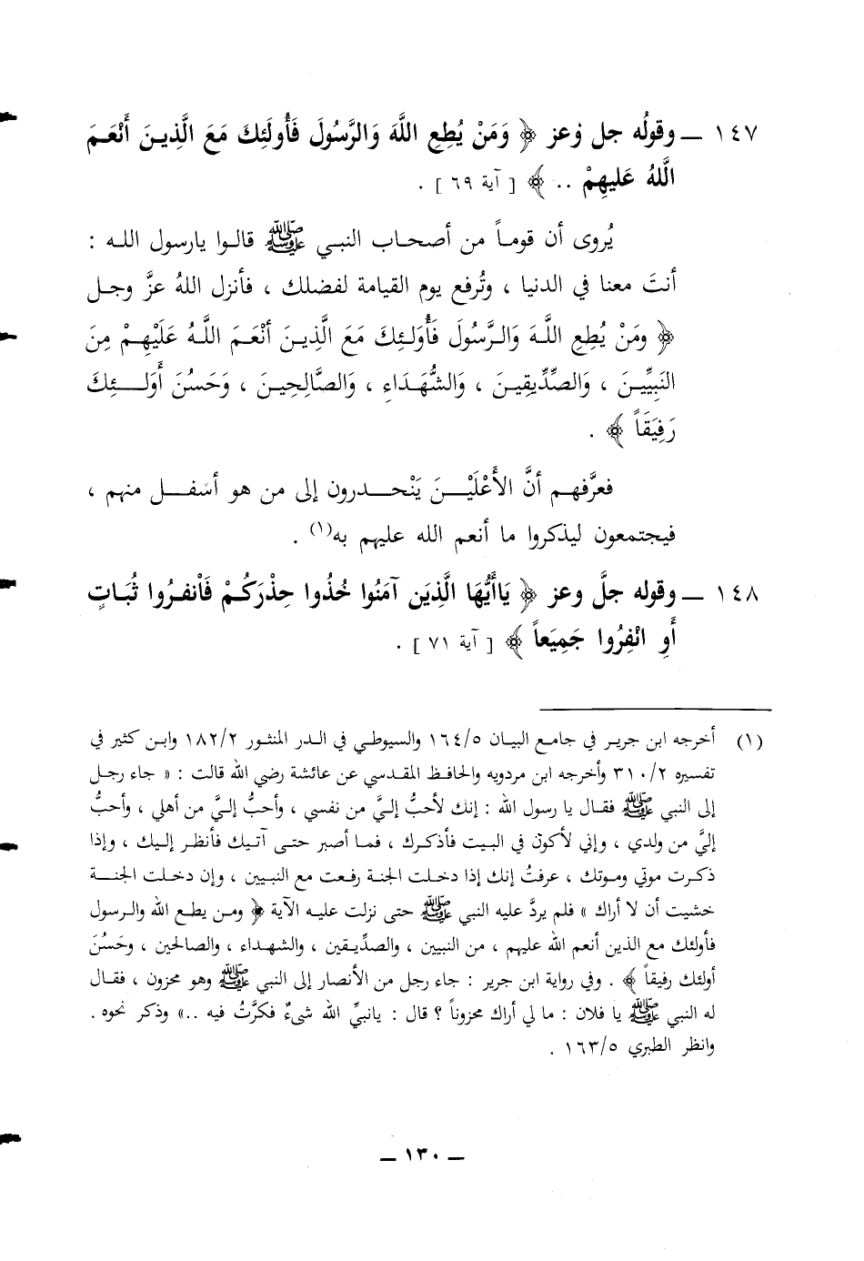 147 وقوله جل وعز (ومن يطع الله والرسول فأولئك مع الذين أنعم الله عليهم) يروى أن قوما من أصحاب النبي صلى الله عليه وسلم قالوا يا رسول الله أنت معنا في الدنيا وترفع يوم القيامة لفضلك فأنزل الله عز وجل (ومن يطع الله والرسول فأولئك مع الذين أنعم الله عليهم من النبيين والصديقين والشهداء والصالحين وحسن أولئك رفيقا) فعرفهم أن الاعلين ينحدرون الى من هو أسفل منهم فيجتمعون ليذكروا ما أنعم الله عليهم به 148 وقوله جل وعز (يا أيها الذين آمنوا خذوا حذركم فانفروا ثبات أو انفروا جميعا)