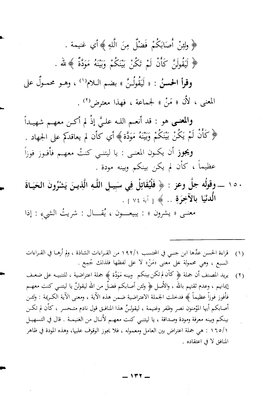 (ولئن أصابكم فضل من الله) أي غنيمة (ليقولن كأن لم تكن بينكم وبينه مودة) لله وقرأ الحسن (ليقولن) بضم اللام وهو محمول على المعنى لان (من) لجماعة فهذا معترض والمعنى هو قد أنعم الله علي إذ لم أكن معهم شهيدا (كأن لم يكن بينكم وبينه مودة) أي كأن لم يعاقدكم على الجهاد ويجوز أن يكون المعنى يا ليتني كنت معهم فأفوز فوزا عظيما كأن لم يكن بينكم وبينه مودة 150 وقوله جل وعز (فليقاتل في سبيل الله الذين يشرون الحياة الدنيا بالآخرة) معنى يشرون يبيعون يقال شريت الشئ إذا