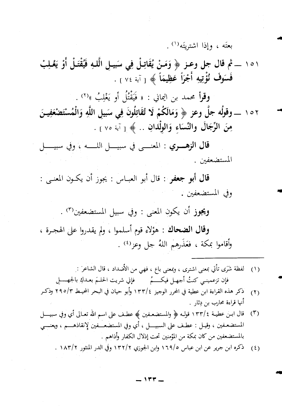 بعته وإذا اشتريته 151 ثم قال جل وعز (ومن يقاتل في سبيل الله فيقتل أو يغلب فسوف نؤتيه أجرا عظيما) وقرأ محمد بن اليماني فيقتل أو يغلب 152 وقوله جل وعز (وما لكم لا تقاتلون في سبيل الله والمستضعفين من الرجال والنساء والولدان) قال الزهري المعنى في سبيل الله وفي سبيل المستضعفين قال أبو جعفر قال أبو العباس يجوز أن يكون المعنى وفي المستضعفين ويجوز أن يكون المعنى وفي سبيل المستضعفين وقال الضحاك هؤلاء قوم أسلموا ولم يقدروا على الهجرة وأقاموا بمكة فعذرهم الله جل وعز