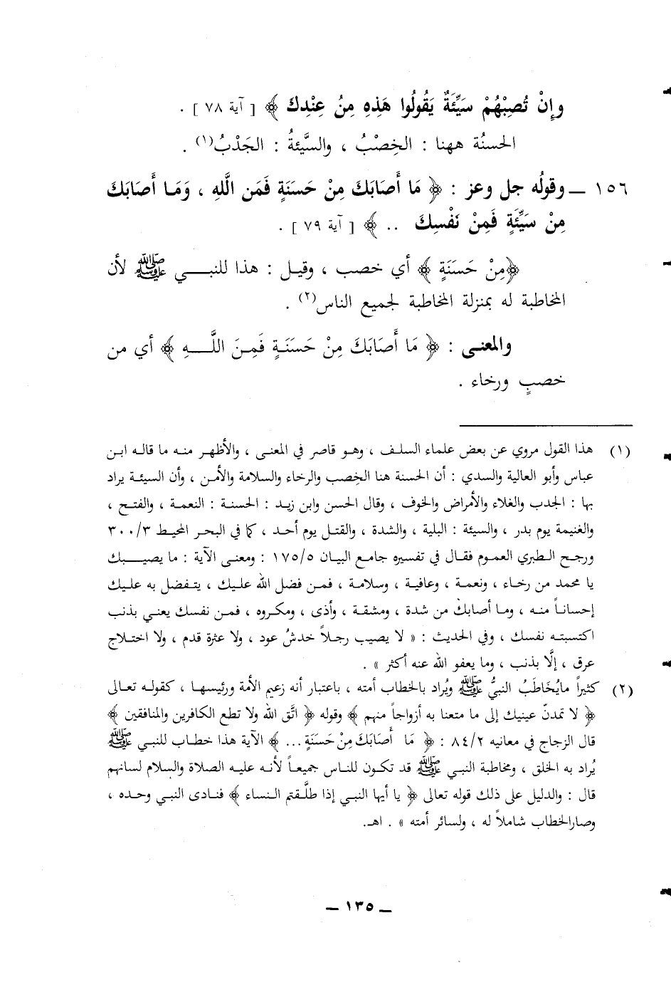 وان تصبهم سيئة يقولوا هذه من عندك) الحسنة ههنا الخصب والسيئة الجدب 156 وقوله جل وعز (ما أصابك من حسنة فمن الله وما أصابك من سيئة فمن نفسك) من حسنة أي خصب وقيل هذا للنبي صلى الله عليه وسلم لان المخاطبة له بمنزلة المخاطبة لجميع الناس والمعنى ما أصابك من حسنة فمن الله أي من خصب ورخاء