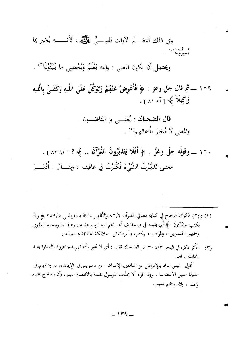 وفي ذلك أعظم الآيات للنبي صلى الله عليه وسلم لانه يخبر بما يسرونه ويحتمل أن يكون المعنى والله يعلم ويحصي ما يبيتون 159 ثم قال جل وعز (فأعرض عنهم وتوكل على الله وكفى بالله وكيلا) قال الضحاك يعنى به المنافقون والمعنى لا تخبر بأسمائهم 160 وقوله جل وعز (أفلا يتدبرون القرآن) معنى تدبرت الشئ فكرت في عاقبته ويقال أدبر