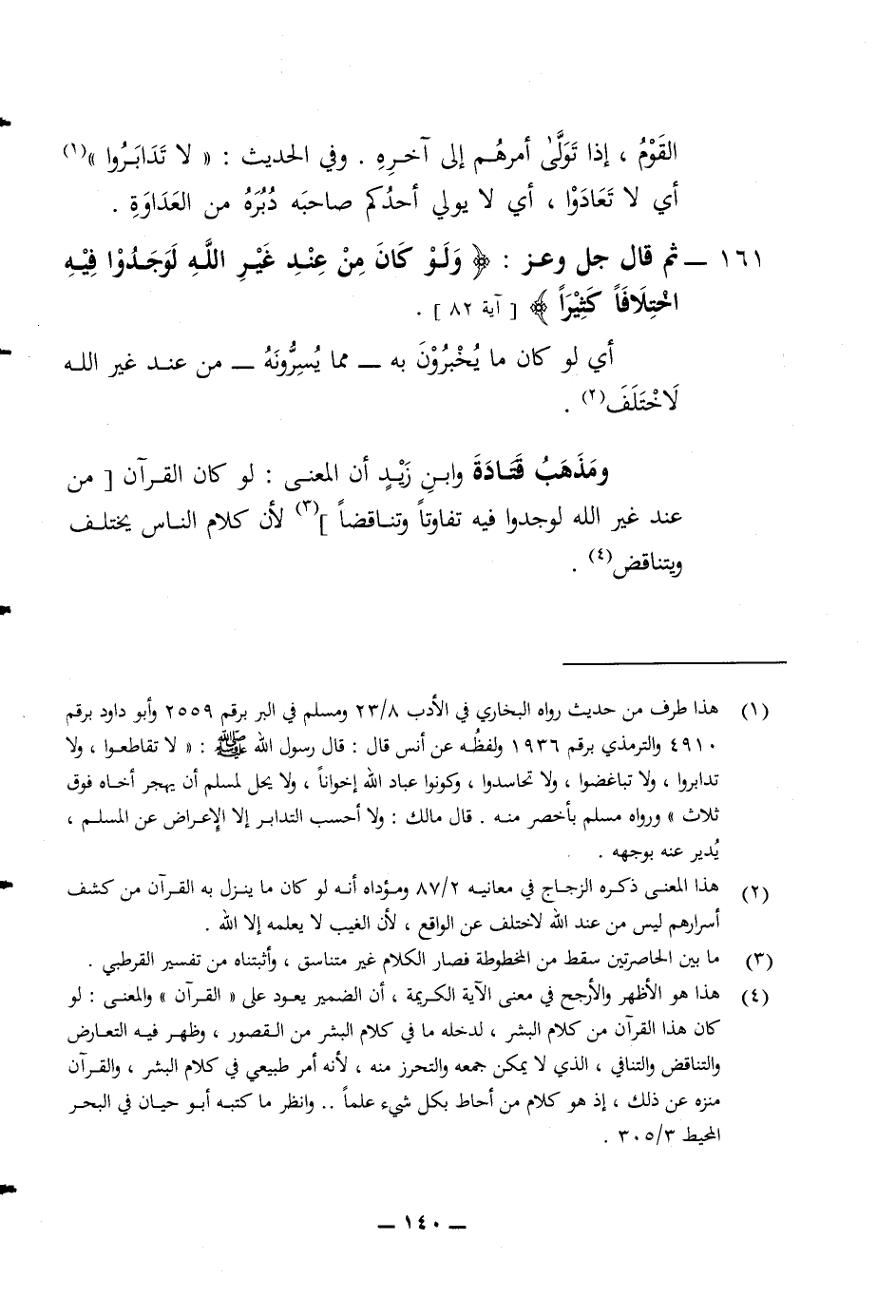 القوم إذا تولى أمرهم الى آخره وفي الحديث لا تدابروا أي لا تعادوا أي لا يولي أحدكم صاحبه دبره من العداوة 161 ثم قال جل وعز (ولو كان من عند غير الله لوجدوا فيه اختلافا كثيرا) أي لو كان ما يخبرون به مما يسرونه من عند غير الله لاختلف ومذهب قتادة وابن زيد أن المعنى لو كان القرآن من عند غير الله لوجدوا فيه تفاوتا وتناقضا لان كلام الناس يختلف