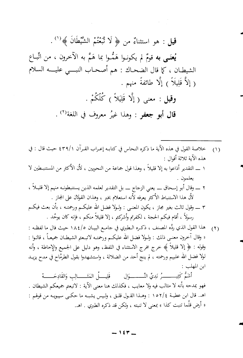 قيل هو استثناء من لاتبعتم الشيطان يعنى به قوم لم يكونوا هموا بما هم به الاخرون من اتباع الشيطان كما قال الضحاك هم اصحاب النبي عليه السلام الا قليلا الا طائفة منهم وقيل معنى الا قليلا كلكم قال أبو جعفر وهذا غير معروف في اللغة