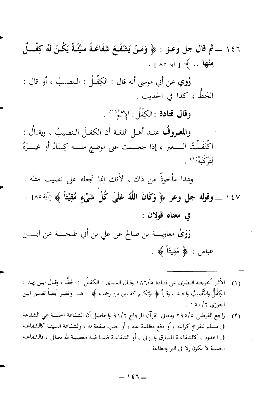 146 ثم قال جل وعز (ومن يشفع شفاعة سيئة يكن له كفل منها) روي عن أبي موسى أنه قال الكفل النصيب أو قل الحظ كذا في الحديث وقال قتادة الكفل الاثم والمعروف عند أهل اللغة أن الكفل النصيب ويقال اكتفلت البعير إذا جعلت على موضع منه كساء أو غيره لتركبه وهذا مأخوذ من ذاك لانك انما تجعله على نصيب مثله 147 وقوله جل وعز (وكان الله على كل شئ مقيتا) في معناه قولان