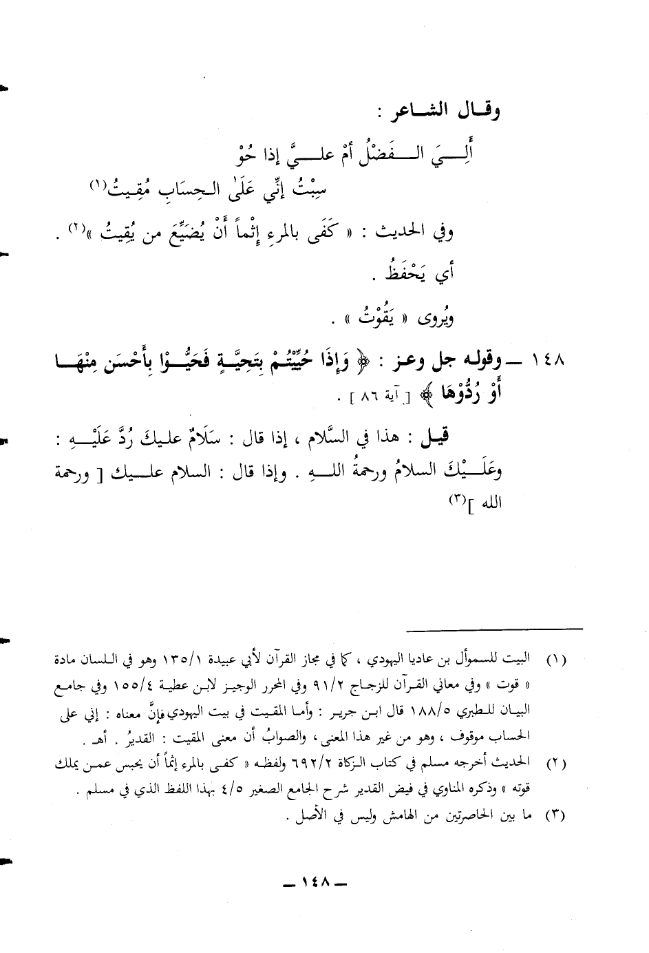 وقال الشاعر ألي الفضل أم علي إذا حو سبت اني على الحساب مقيت وفي الحديث كفى بالمرء اثما أن يضيع من يقيت أي يحفظ ويروى يقوت 148 وقوله جل وعز (وإذا حييتم بتحية فحيوا بأحسن منها أو ردوها) قيل هذا في السلام إذا قال سلام عليكم رد عليه