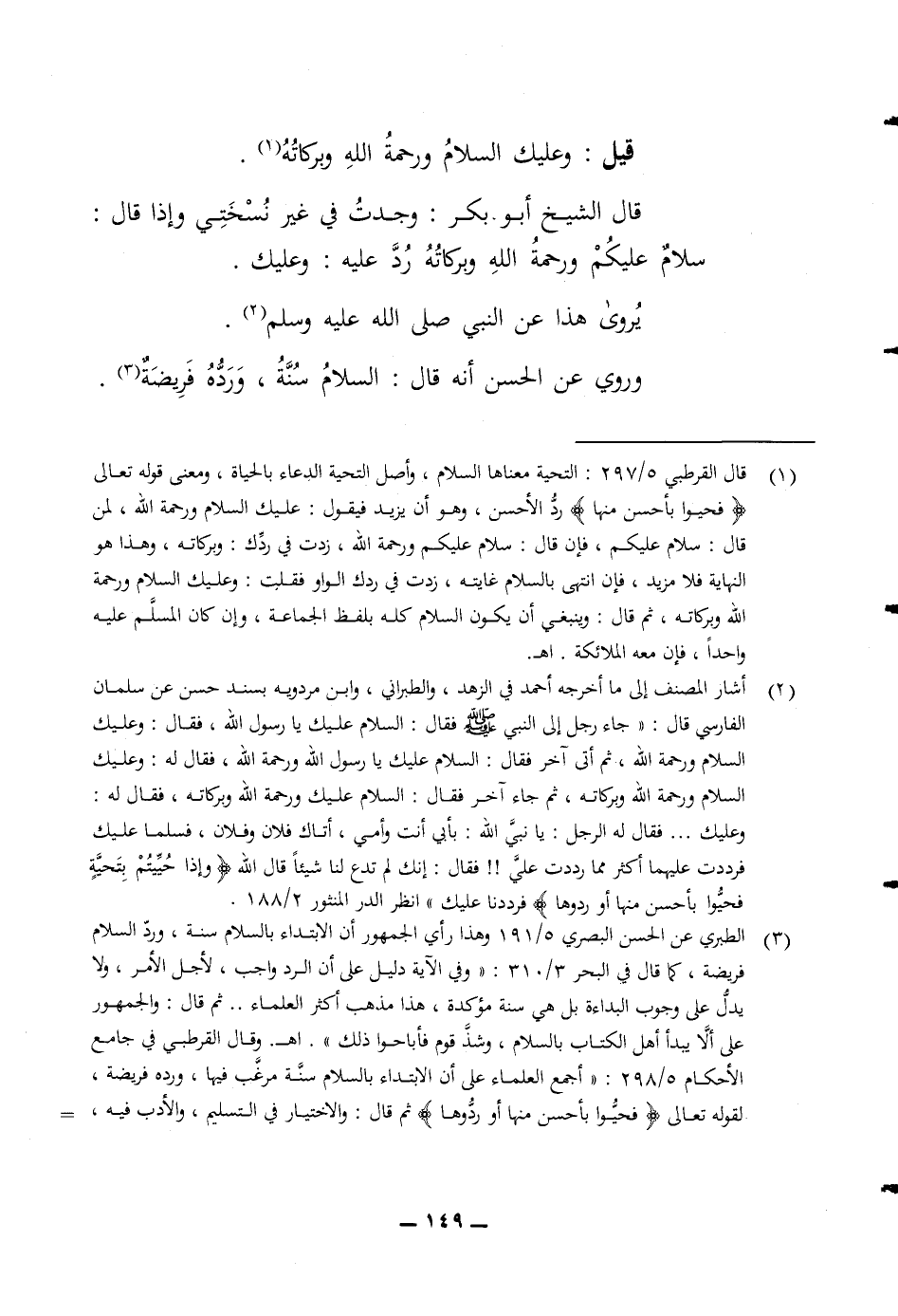 قيل وعليك السلام ورحمة الله وبركاته قال الشيخ أبو بكر وجدت في غير نسختي وإذا قال سلام عليكم ورحمة الله وبركاته رد عليه وعليك يروى هذا عن النبي صلى الله عليه وسلم وروي عن الحسن أنه قال السلام سنة ورده فريضة