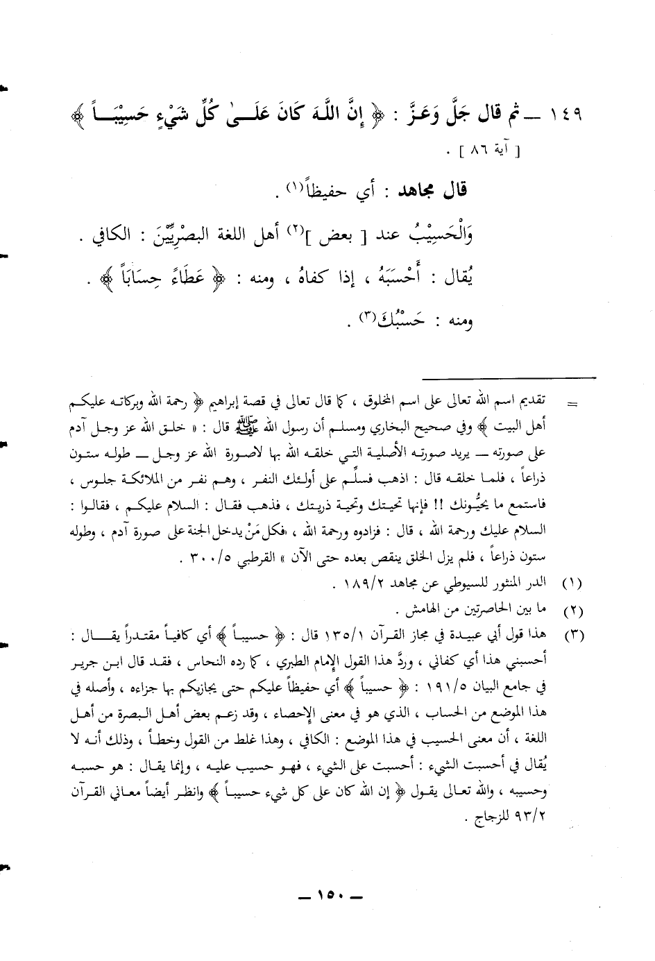149 ثم قال جل وعز (إن الله كان على كل شئ حسيبا) قال مجاهد أي حفيظا والحسيب عند بعض أهل اللغة البصريين الكافي يقال أحسبه إذا كفاه ومنه (عطاء حسابا) ومنه حسبك