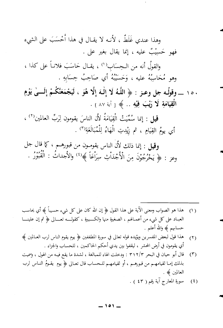 وهذا عندي غلط لانه لا يقال في هذا أحسب على الشئ فهو حسيب عليه انما يقال بغير على والقول أنه من الحساب يقال حاسب فلانا على كذا وهو محاسبه عليه وحسيبه أي صاحب حسابه 150 وقوله جل وعز (الله لا إله الا هو ليجمعنكم الى يوم القيامة لا ريب فيه) قيل انما سميت القيامة لان الناس يقومون لرب العالمين