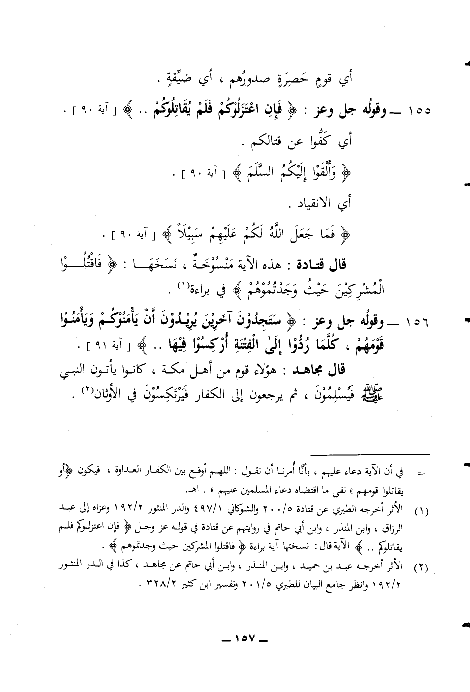 أي قوم حصرة صدورهم أي ضيقة 155 وقوله جل وعز (فان اعتزلوكم فلم يقاتلوكم) أي كفوا عن قتالكم (وألقوا اليكم السلم) أي الانقياد (فما جعل الله لكم عليهم سبيلا) قال قتادة هذه الآية منسوخة نسخها (فاقتلوا المشركين حيث وجدتموهم) في براءة 156 وقوله جل وعز (ستجدون آخرين يريدون أن يأمنوكم ويأمنوا قومهم كلما ردوا الى الفتنة أركسوا فيها)