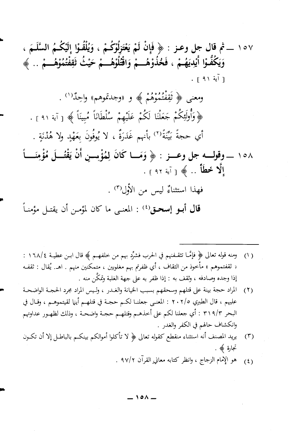 157 ثم قال جل وعز (فان لم يعتزلوكم ويلقوا اليكم السلم ويكفوا أيديهم فخذوهم واقتلوهم حيث ثقفتموهم) ومعنى ثقفتموهم وجدتموهم واحد (وأولئكم جعلنا لكم عليهم سلطانا مبينا) أي حجة بينة بأنهم غدرة لا يوفون بعهد ولا هدنة 158 وقوله جل وعز (وما كان لمؤمن أن يقتل مؤمنا الا خطأ) فهذا استثناء ليس من الاول قال أبو اسحق المعنى ما كان لمؤمن أن يقتل مؤمنا