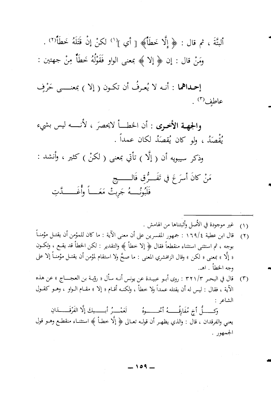 البتة ثم قال (الا خطأ) أي لكن ان قتله خطأ ومن قال ان الا بمعنى الواو فقوله خطأ من جهتين احداهما أنه لا يعرف أن تكون (الا) بمعنى حرف عاطف والجهة الاخرى أن الخطأ لا يحصر لانه ليس بشئ يقصد ولو كان يقصد لكان عمدا وذكر سيبويه أن (إلا) تأتي بمعنى (لكن) كثير وأنشد من كان أسرع في تفرق فالج فلبونه جربت معا وأغدت