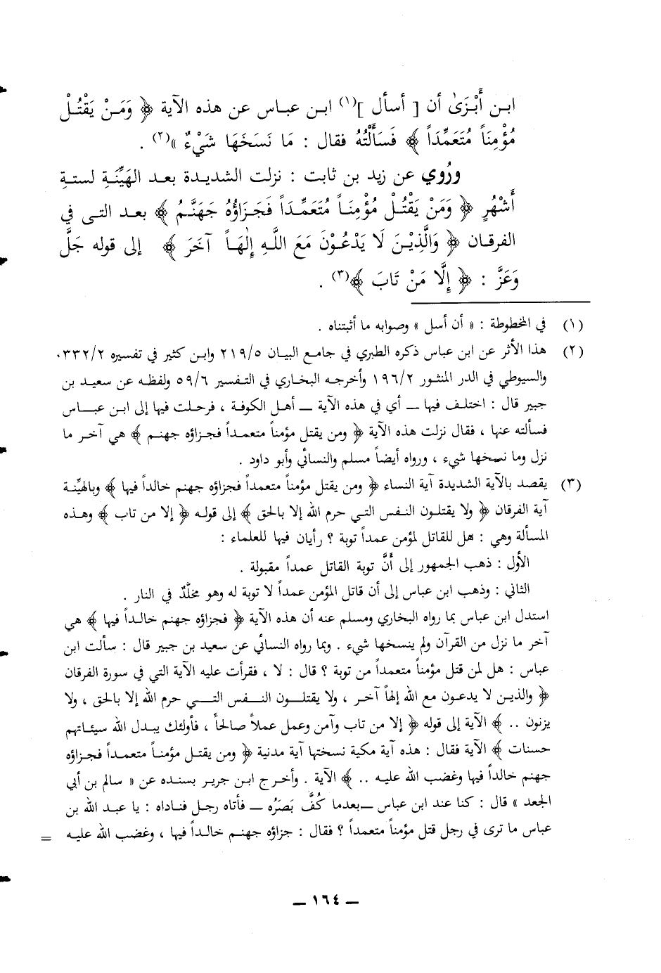 ابن أبزى أن أسأل ابن عباس عن هذه الآية (ومن يقتل مؤمنا متعمدا) فسألته فقال ما نسخها شئ وروي عن زيد بن ثابت نزلت الشديدة بعد الهينة لستة أشهر (ومن يقتل مؤمنا متعمدا فجزاؤه جهنم) بعد التى في الفرقان (والذين لا يدعون مع الله الها آخر) الى قوله جل وعز (الا من تاب)