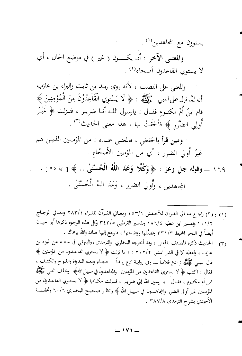 والمعنى الآخر أن يكون غير في موضع الحال أي لا يستوي القاعدون أصحاء والمعنى على النصب لانه روى زيد بن ثابت والبراء بن عازب أنه لما نزل على النبي صلى الله عليه وسلم (لا يستوي القاعدون من المؤمنين) قام ابن أم مكتوم فقال يا رسول الله أنا ضرير فنزلت (غير أولي الضرر) فألحقت بها هذا معنى الحديث ومن قرأ بالخفض فالمعنى عنده من المؤمنين الذين هم غير أولي الضرر أي من المؤمنين الاصحاء 169 وقوله جل وعز (وكلا وعد الله الحسنى) المجاهدين وأولي الضرر وعد الله الحسنى