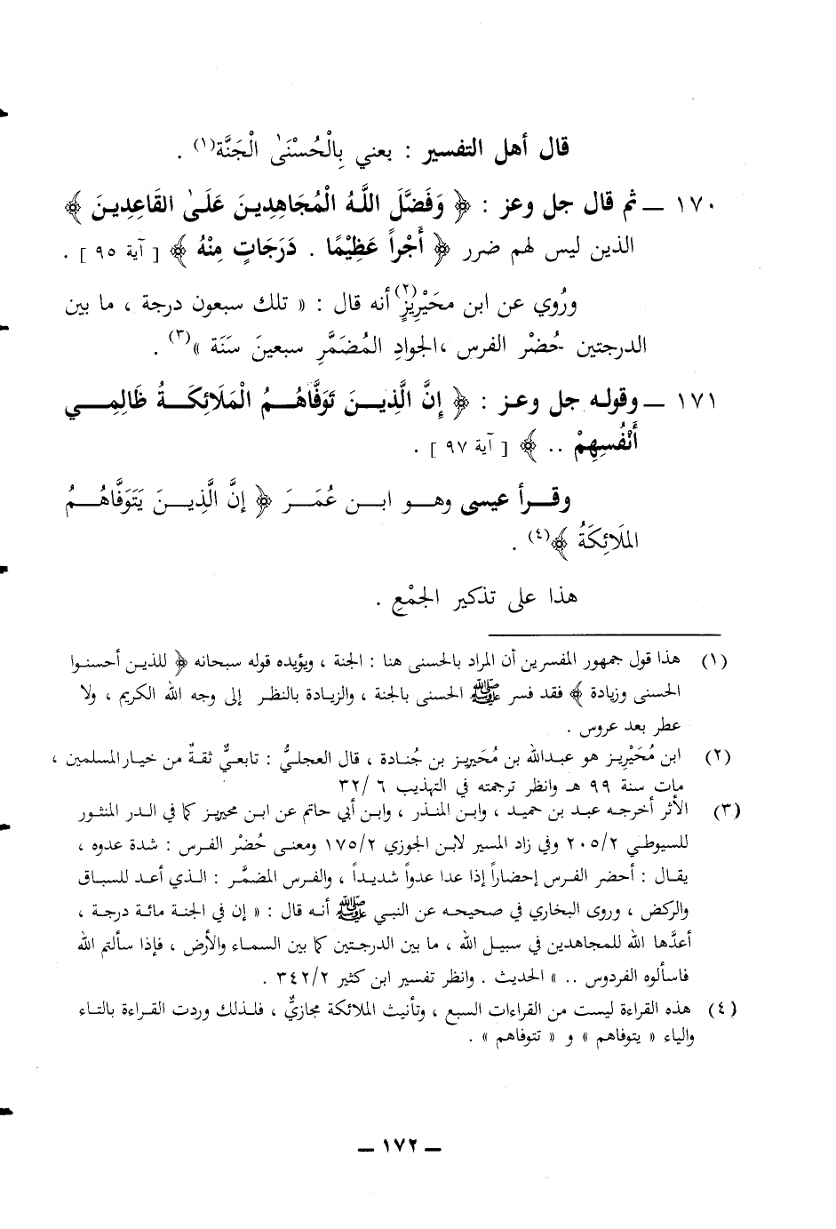 قال أهل التفسير يعني بالحسنى الجنة 170 ثم قال جل وعز (وفضل الله المجاهدين على القاعدين) الذين ليس لهم ضرر (أجرا عظيما درجات منه) وروي عن ابن محيريز أنه قال تلك سبعون درجة ما بين الدرجتين حضر الفرس الجواد المضمر سبعين سنة 171 وقوله جل وعز (ان الذين توفاهم الملائكة ظالمي أنفسهم) وقرأ عيسى وهو ابن عمر (ان الذين يتوفاهم الملائكة) هذا على تذكير الجمع
