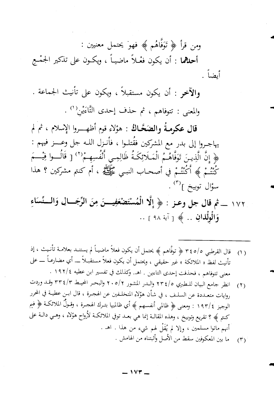 ومن قرأ (توفاهم) فهو يحتمل معنيين أحدهما أن يكون فعلا ماضيا ويكون على تذكير الجمع أيضا والآخر أن يكون مستقبلا ويكون على تأنيث الجماعة والمعنى تتوفاهم ثم حذف إحدى التاءين قال عكرمة والضحاك هؤلاء قوم أظهروا الاسلام ثم لم يهاجروا الى بدر مع المشركين فقتلوا فأنزل الله جل وعز فيهم (ان الذين توفاهم الملائكة ظالمي أنفسهم قالوا فيم كنتم) أكنتم في أصحاب النبي صلى الله عليه وسلم أم كنتم مشركين هذا سؤال توبيخ 172 ثم قال جل وعز (الا المستضعفين من الرجال والنساء والولدان)